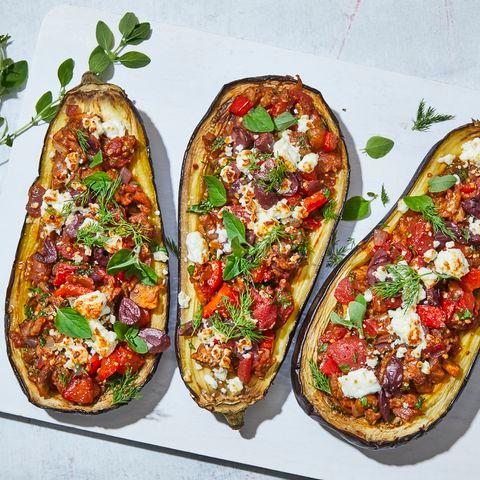 This stuffed eggplant is filled with veggies and flavors of the Mediterranean. The dish is easy to pull together and the addition of cumin gives it a sweet, earthy note.