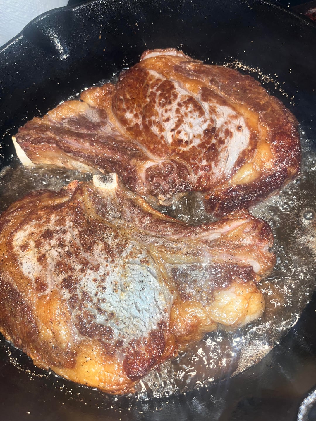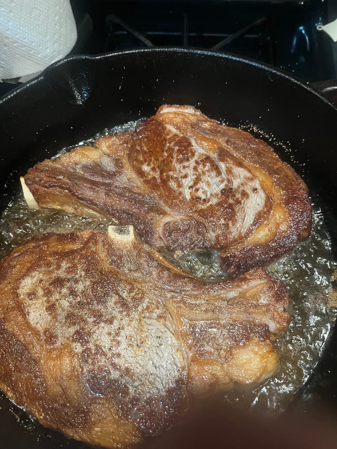 You might want to go back to the basics and use way less oil. That is way too much oil. You can’t even sear that steak with that much oil. It’s just getting deep fried.