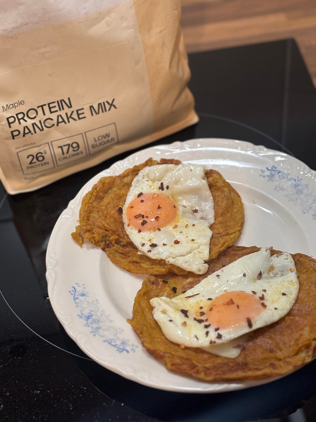 Breakfast– corn protein pancakes with egg and cheese (298 cal / 29g protein)