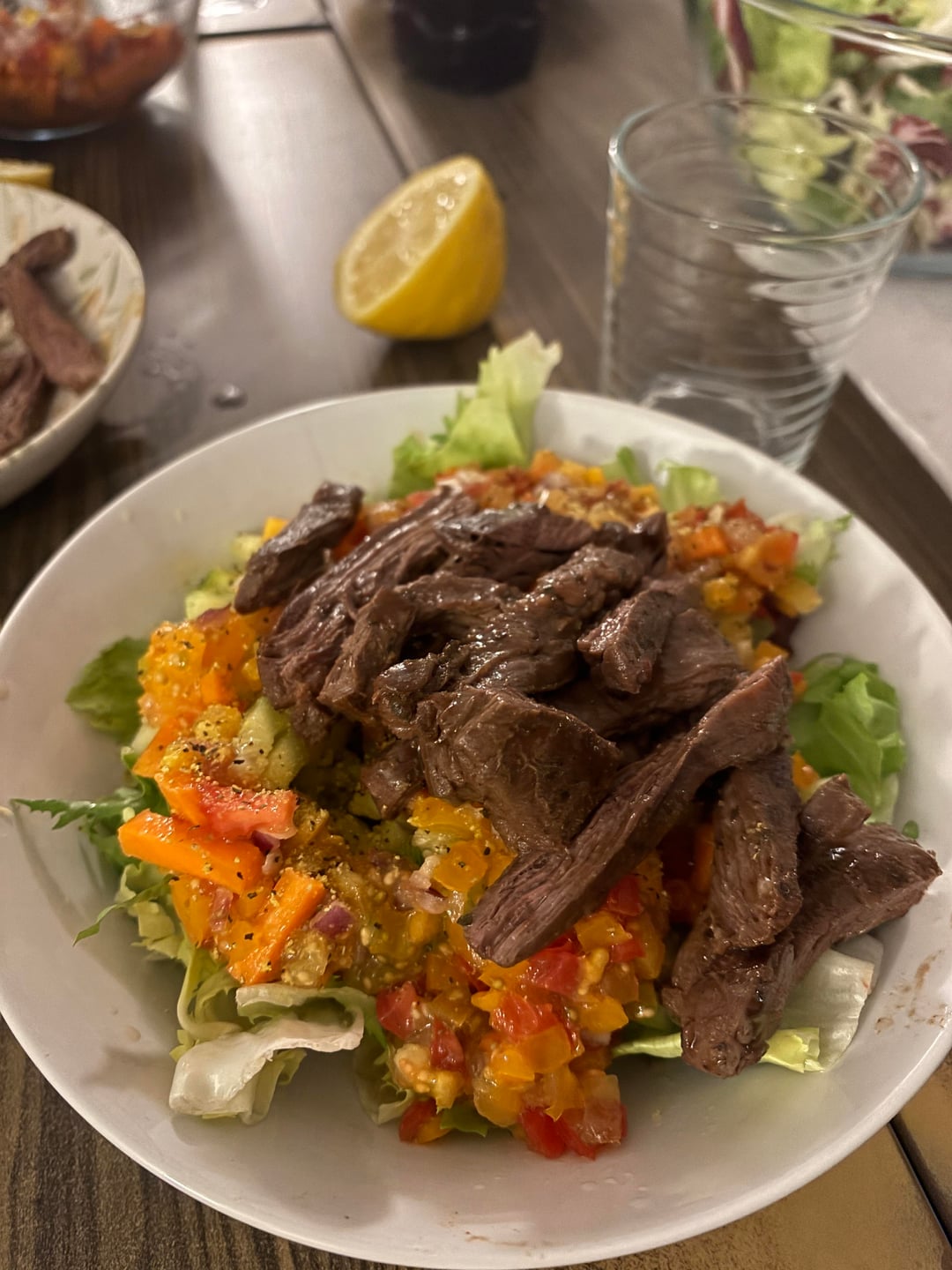 Dinner – marinated steak 200g (uncooked) with salad (315 cal / 34g protein)
