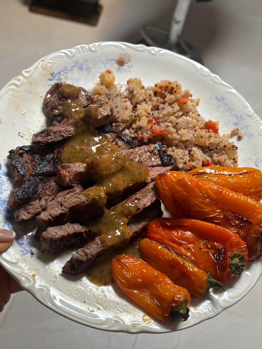 Lunch – steak ~300g (uncooked) with mini bell peppers + quinoa (428 cal / 68g protein)