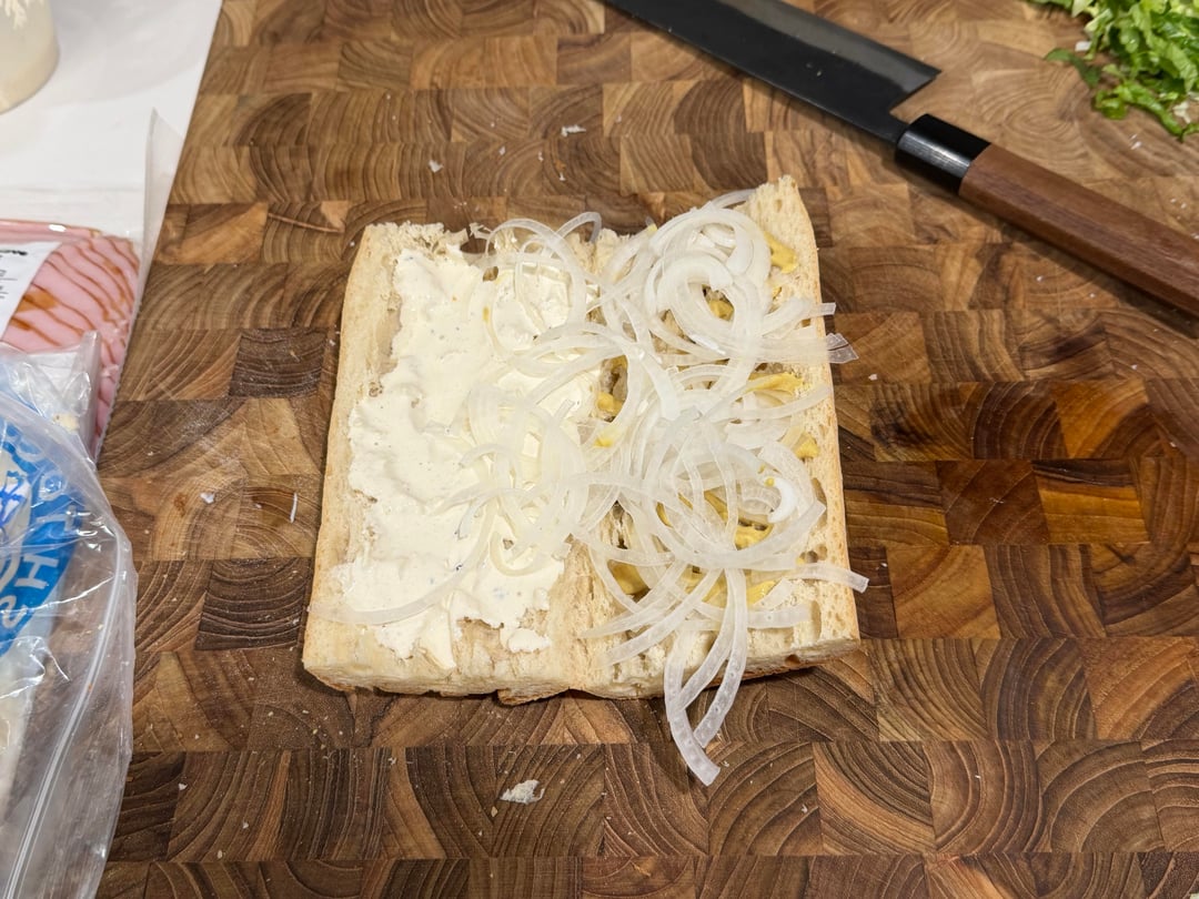 Normally you would put half of it or less. Some cheese, maybe a boiled egg, lettuce , tomato or cucumber, one – maybe 2 slices of meat in a layer if it’s very thinly sliced.