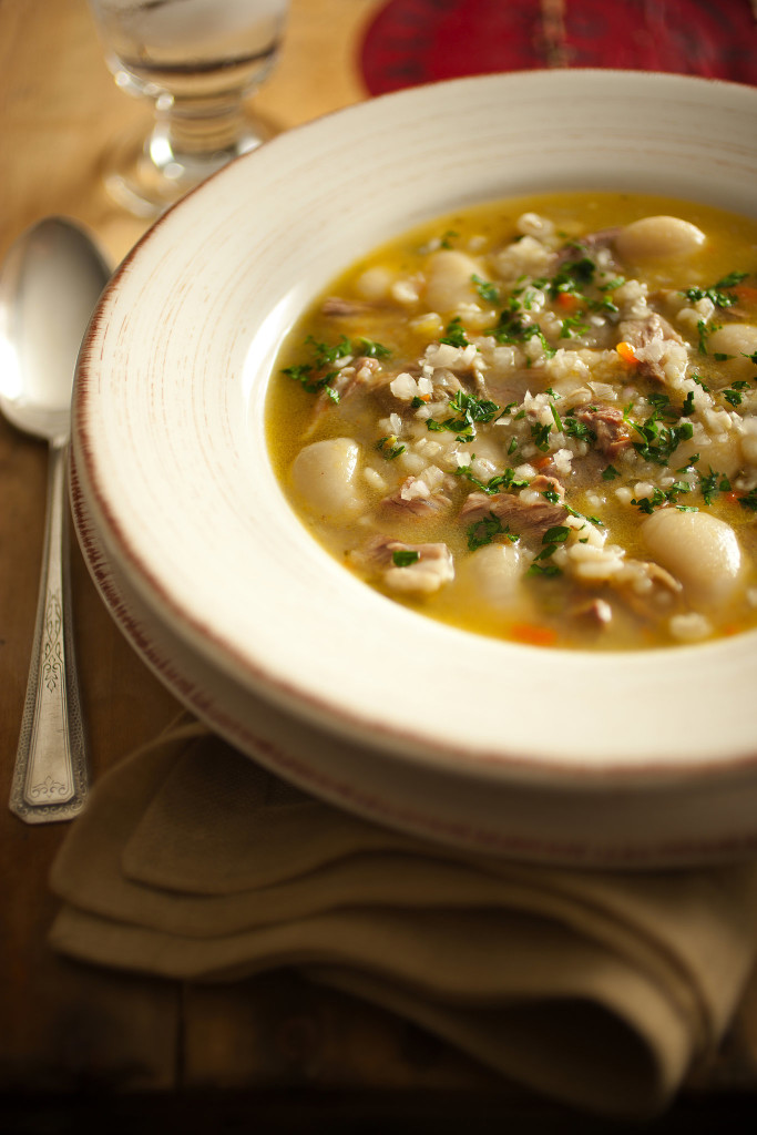- In a soup pot, combine celery, carrot, onion, garlic, olive oil and salt. Cover and cook over low heat, stirring occasionally, until soft, about 10 minutes. Add lima beans, barley, 8 cups water, bones, porcini, thyme and bay leaf, and bring to a boil. Reduce heat to medium-low and simmer, uncovered, until beans are tender, about 1 1/2 hours.
