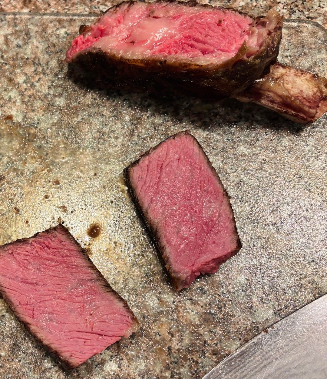 Sous vide for 6 hours @ 137°. Seared on the Blackstone when it reached 500° and cooked with beef tallow, and then finished off on medium heat with butter. At rest, finished with flaked salt and garlic parmesan butter dollops.