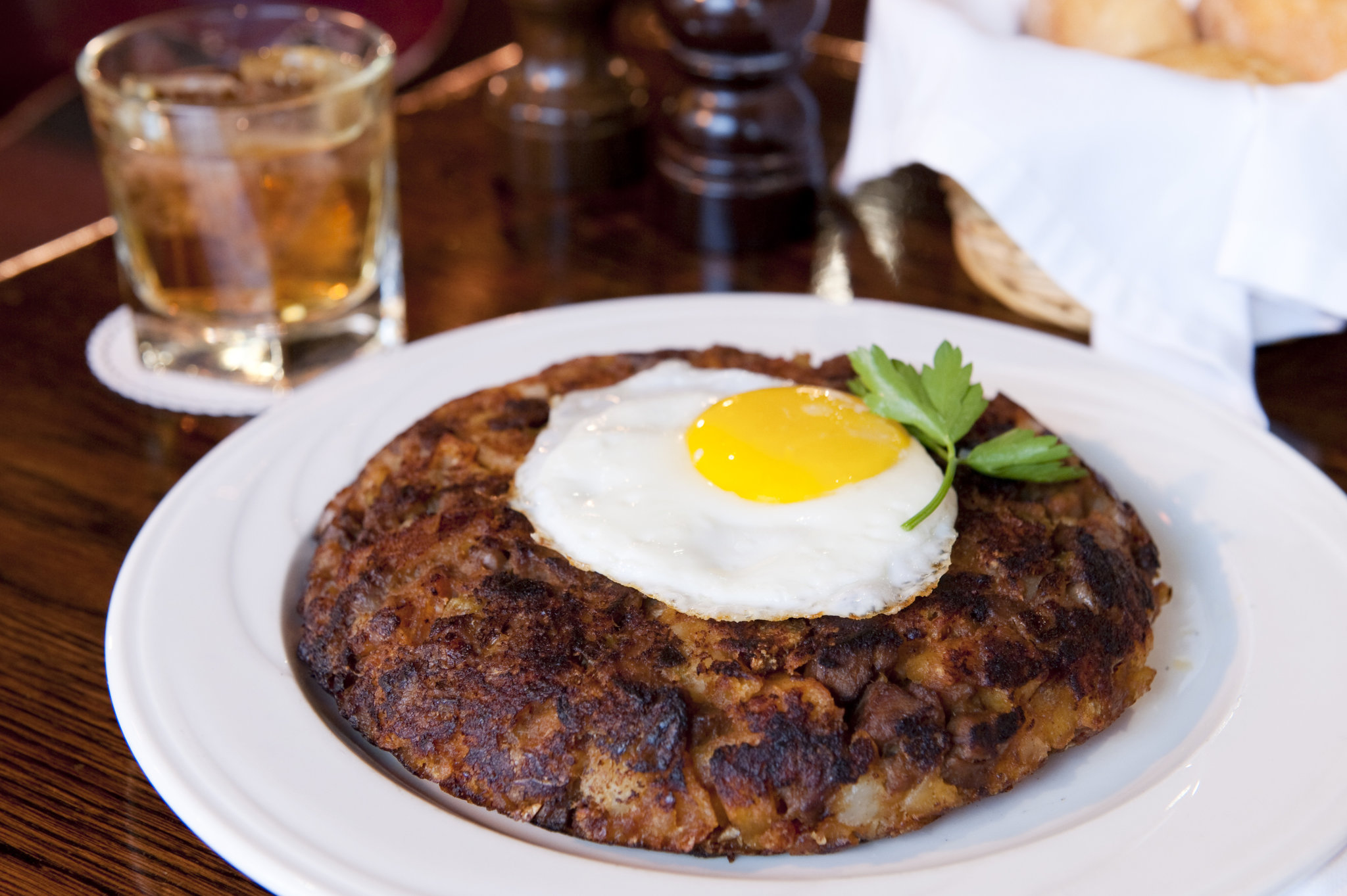 - To serve, invert hash onto a warmed serving platter. Top with fried or poached eggs, and garnish with chives. Serve immediately.