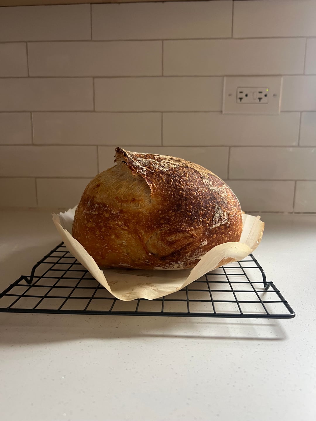 My loaf was making crackling noises when it came out which I read was a good sign! My first 2 loafs came out gummy and did not rise like this.