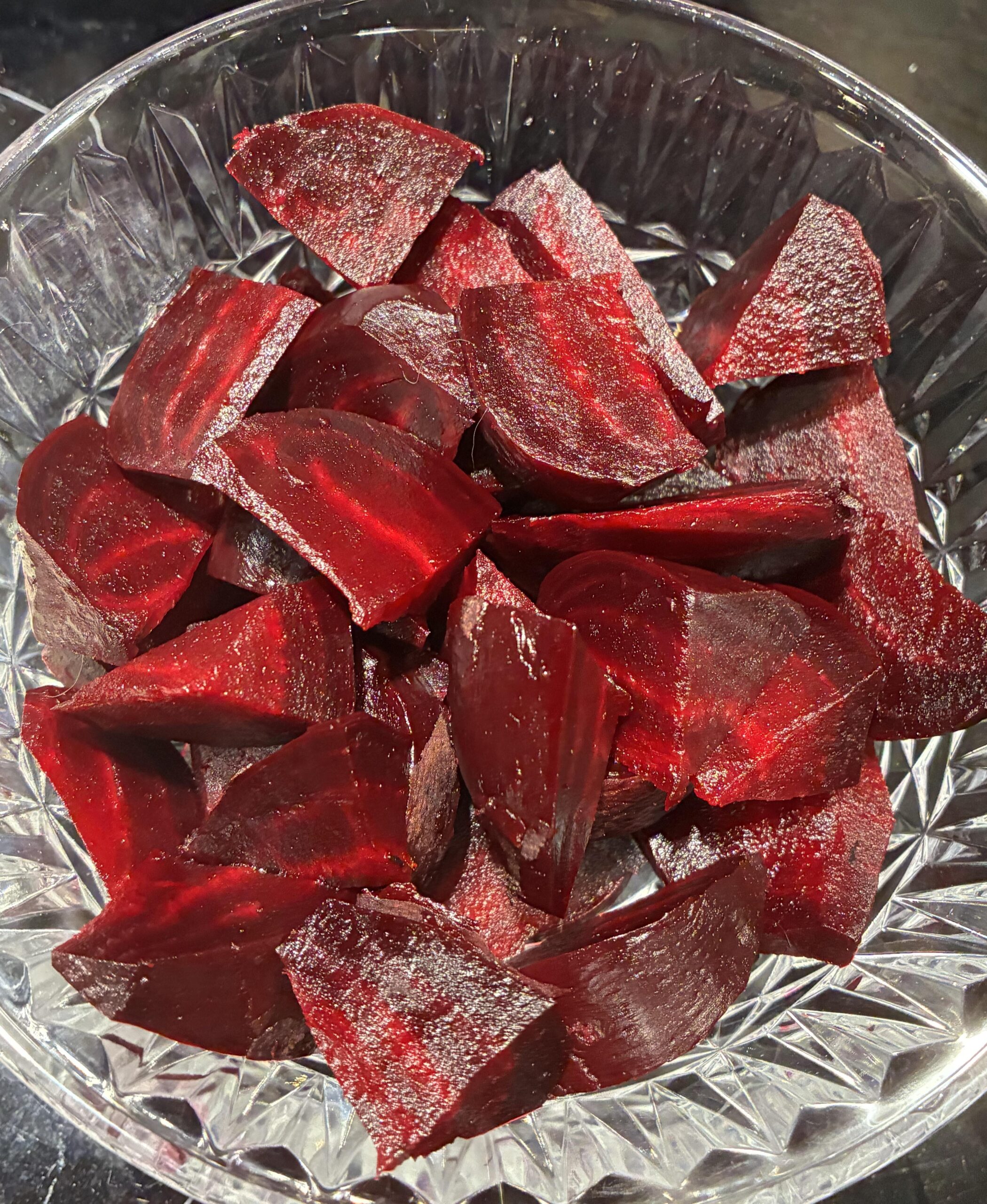 I steamed three beets, removed most of their skin, chopped them and mixed in some EVOO, rice vinegar and salt. Feel free to add additional ingredients (minced onions/shallots, chopped fresh parsley, BP…).