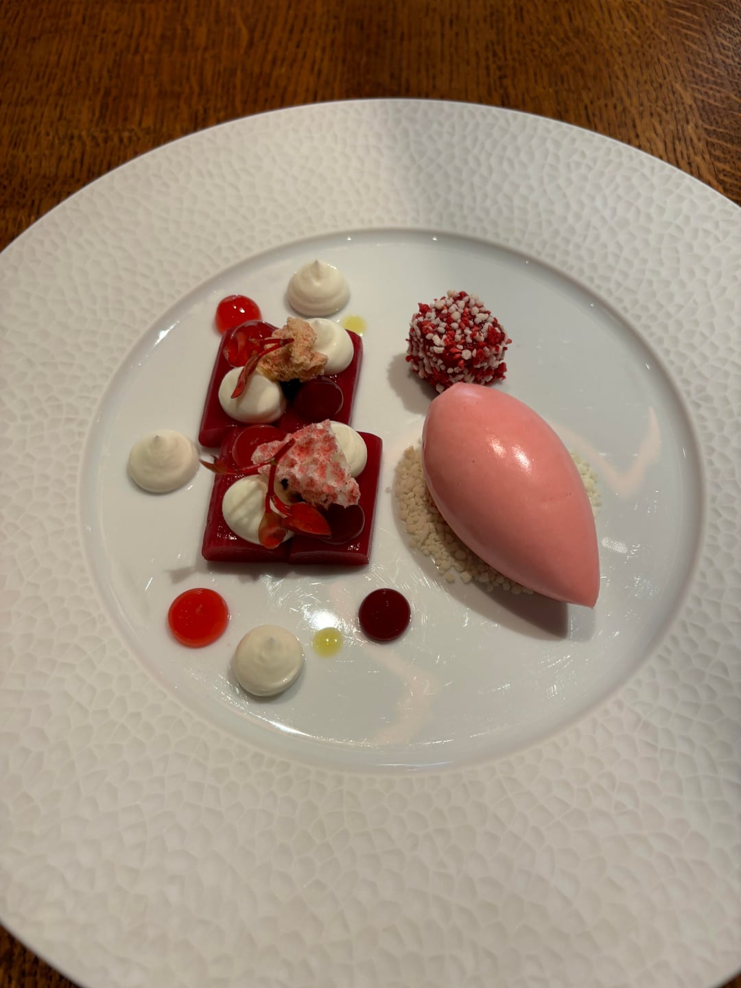 Then a rhubarb dessert: poached rhubarb with hibiscus, yoghurt cream, olive oil, rhubarb and vanilla sorbet, cake, sponge cake