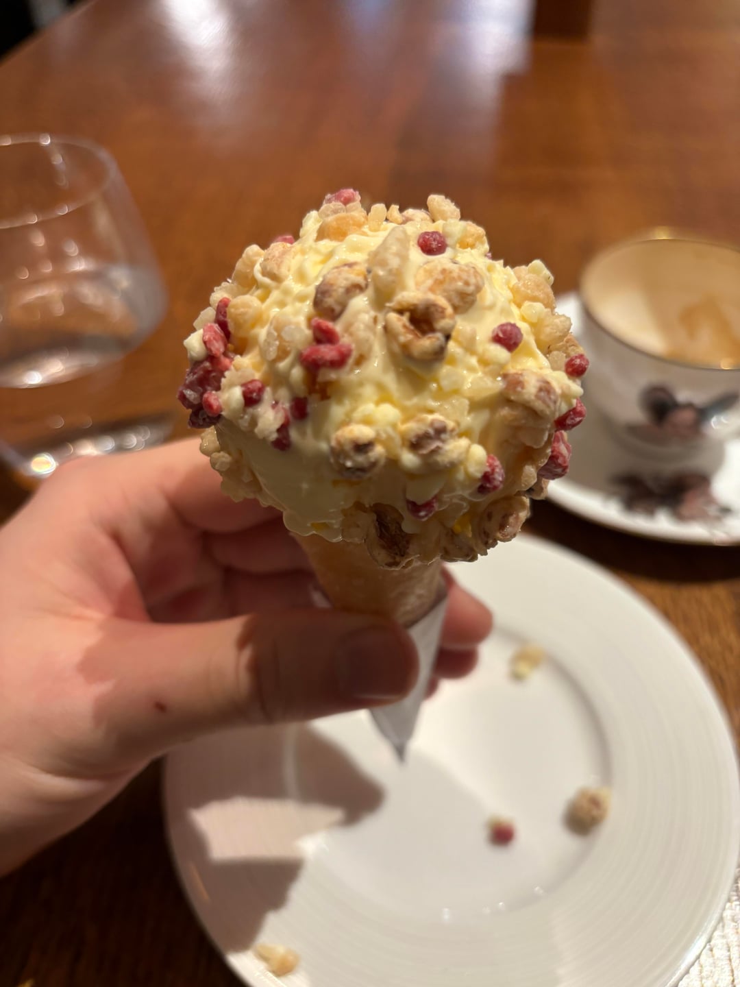 The final course was the nitrogen ice cream, consisting of a wafer thin corner filled with rhubarb compote, lemon ice cream and topped with popping candy