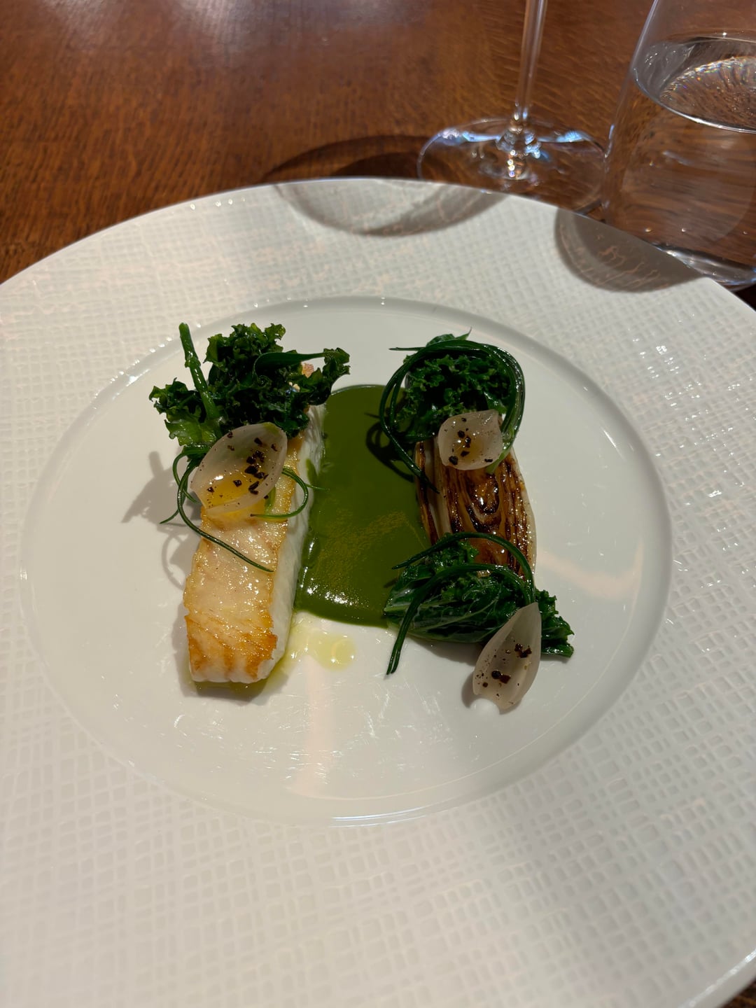 Than came a nice piece of halibut served with a very complex green sauce, braised chicory