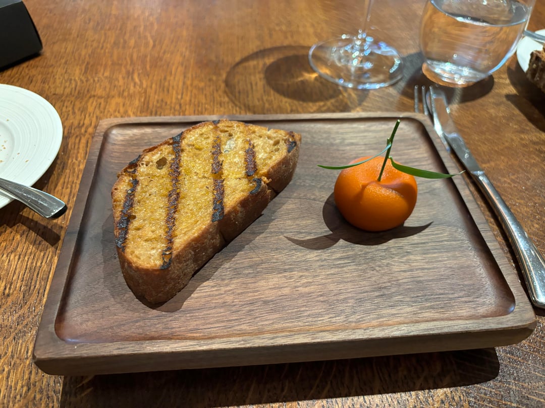 The meat fruit: chicken liver parfait surrounded by mandarin, served with grilled bread