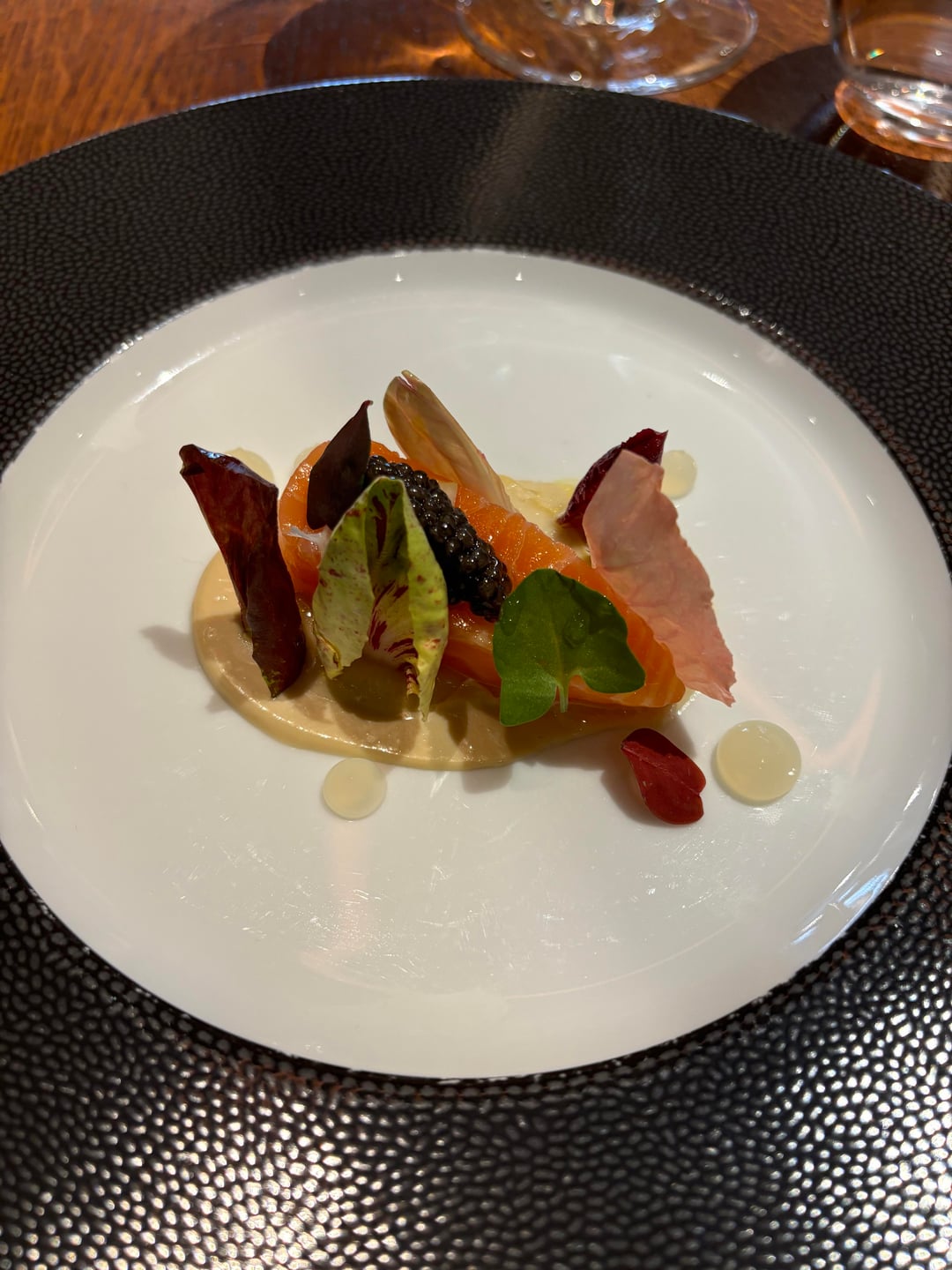 Our first course was hay smoked salmon, with gentlemen’s relish, caviar and pickled lemon salad