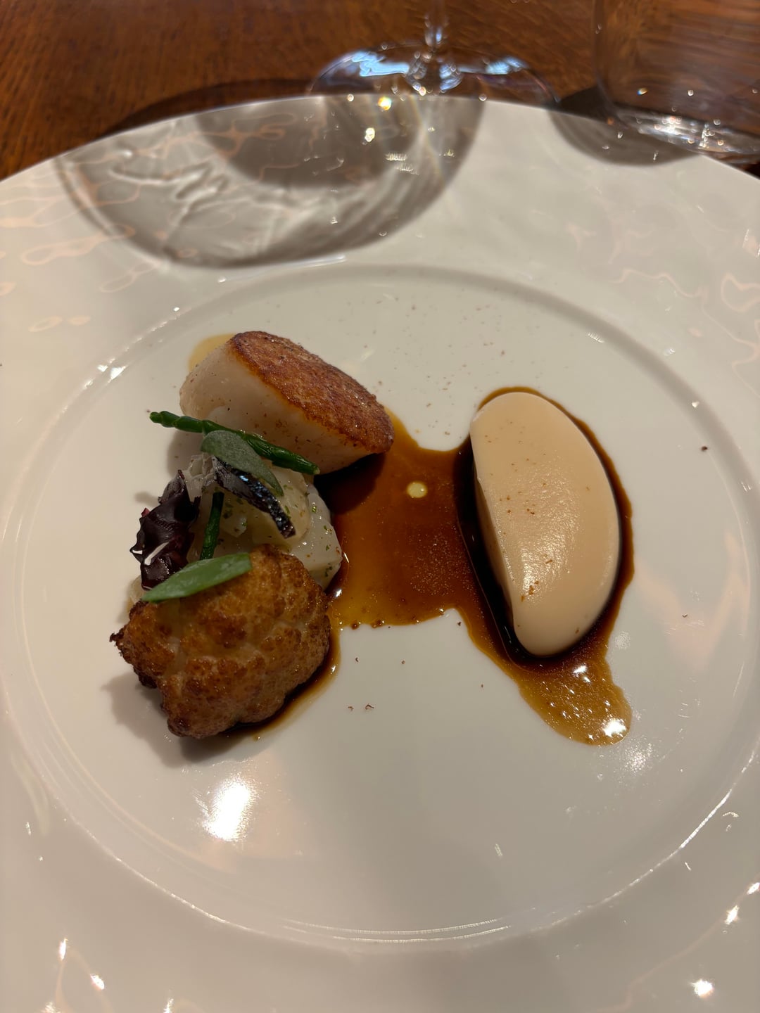 After that came a perfectly fried scallop with scallop tartare, a cauliflower puree, and a nice jus