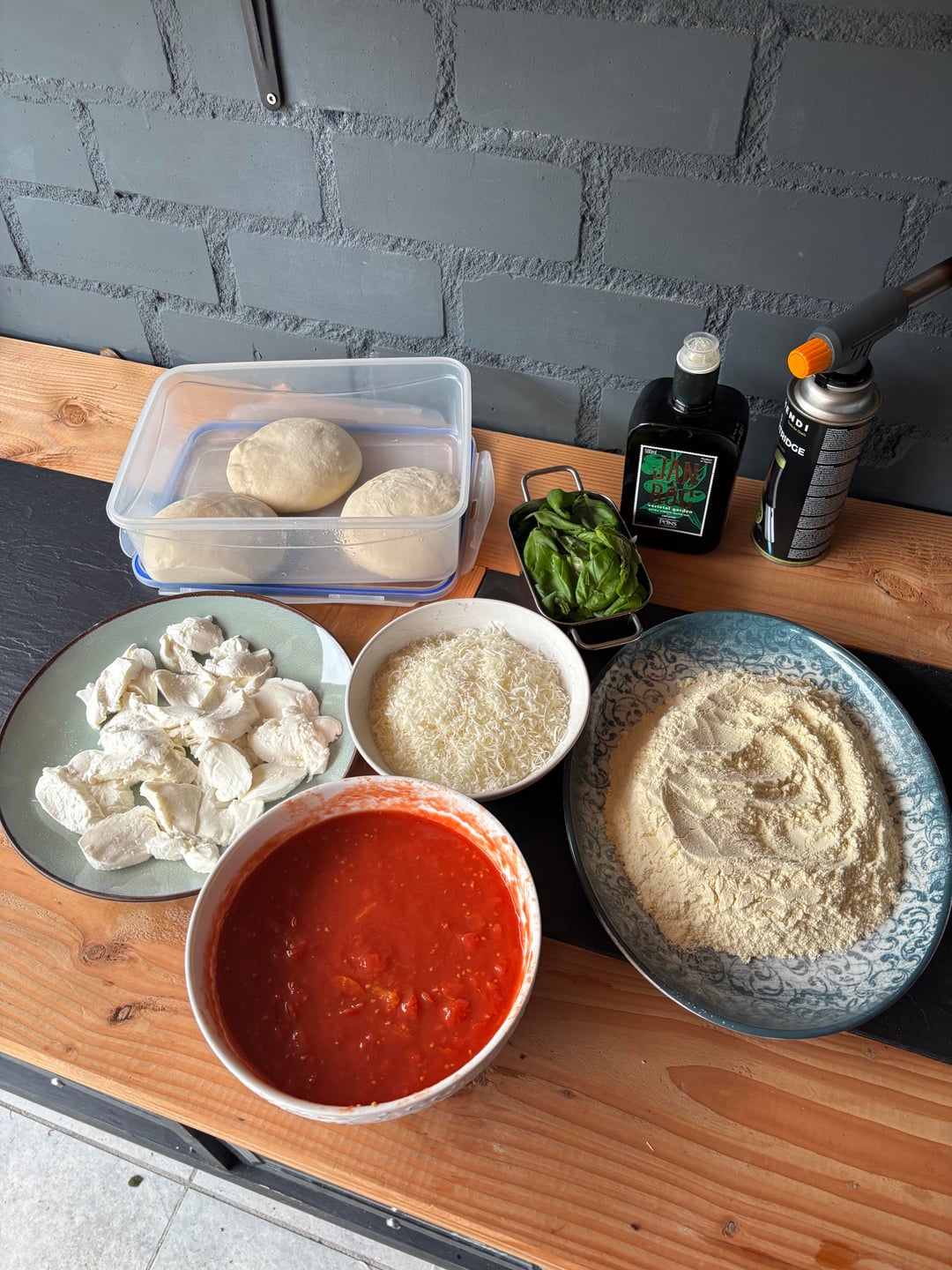 In the 2nd pic i’ve got the sauce, grated pecorino, mozzarella and basil and olive oil.