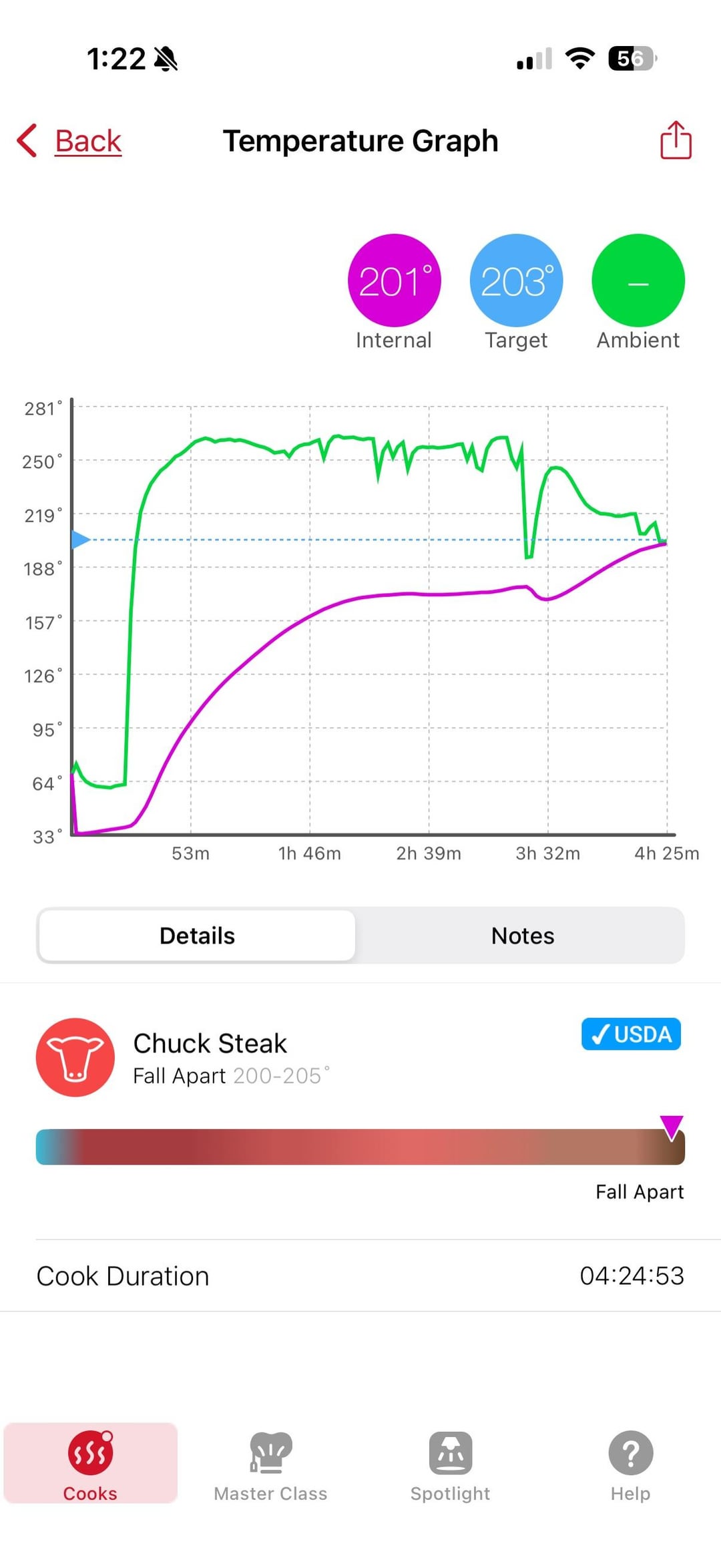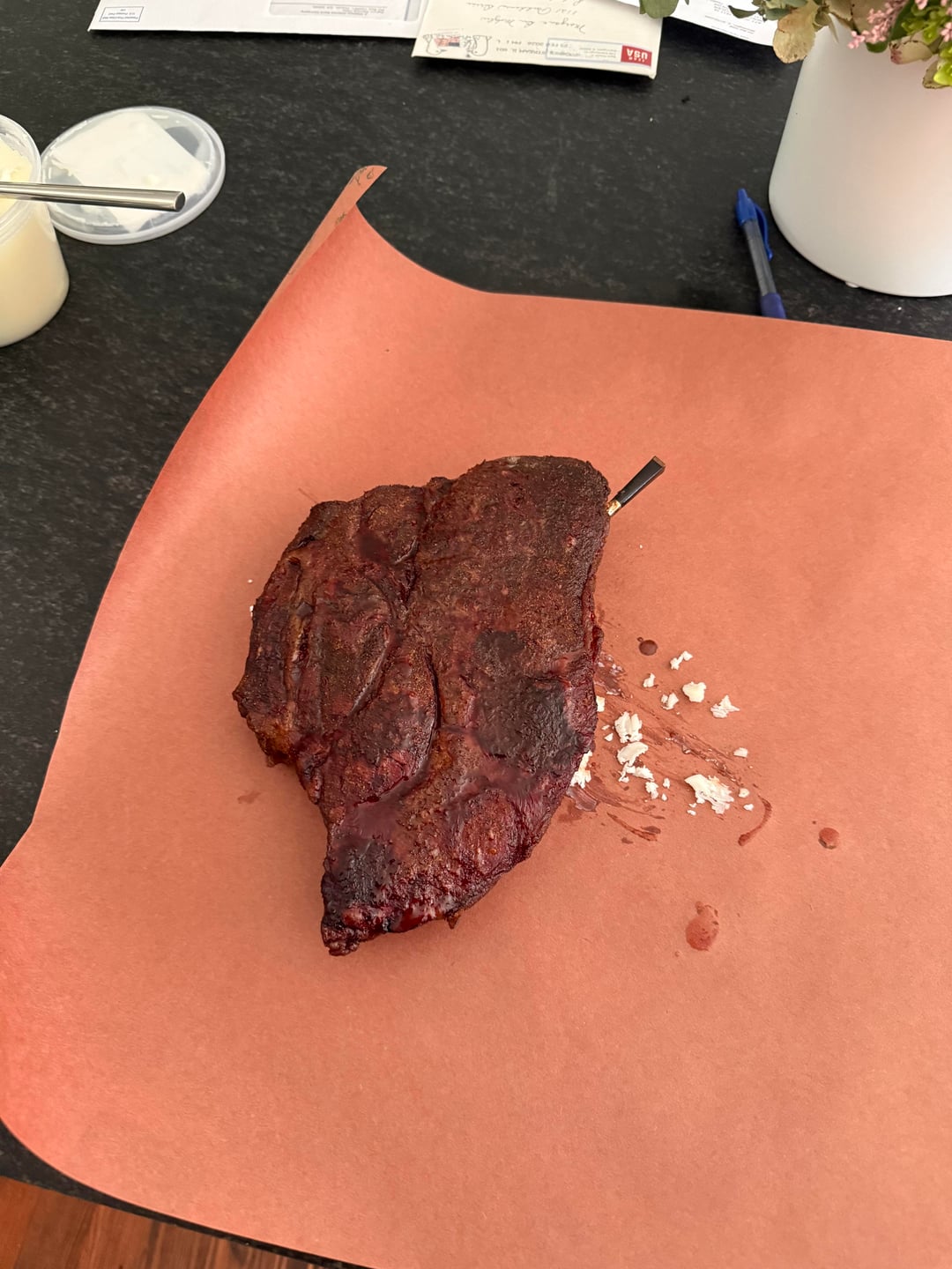 Dry brined for 24 hours, threw it on around 9am and held a steady 250-260 for 4 hours, had a good stall around 172 degrees. Bark wasn’t great (should’ve used a coarse rub but didn’t have any), wrapped it in butcher paper around 175, then took it off around 201 when it was prone tender. Rested in a warm towel in a cooler for 3 hours (wasn’t ready to eat)