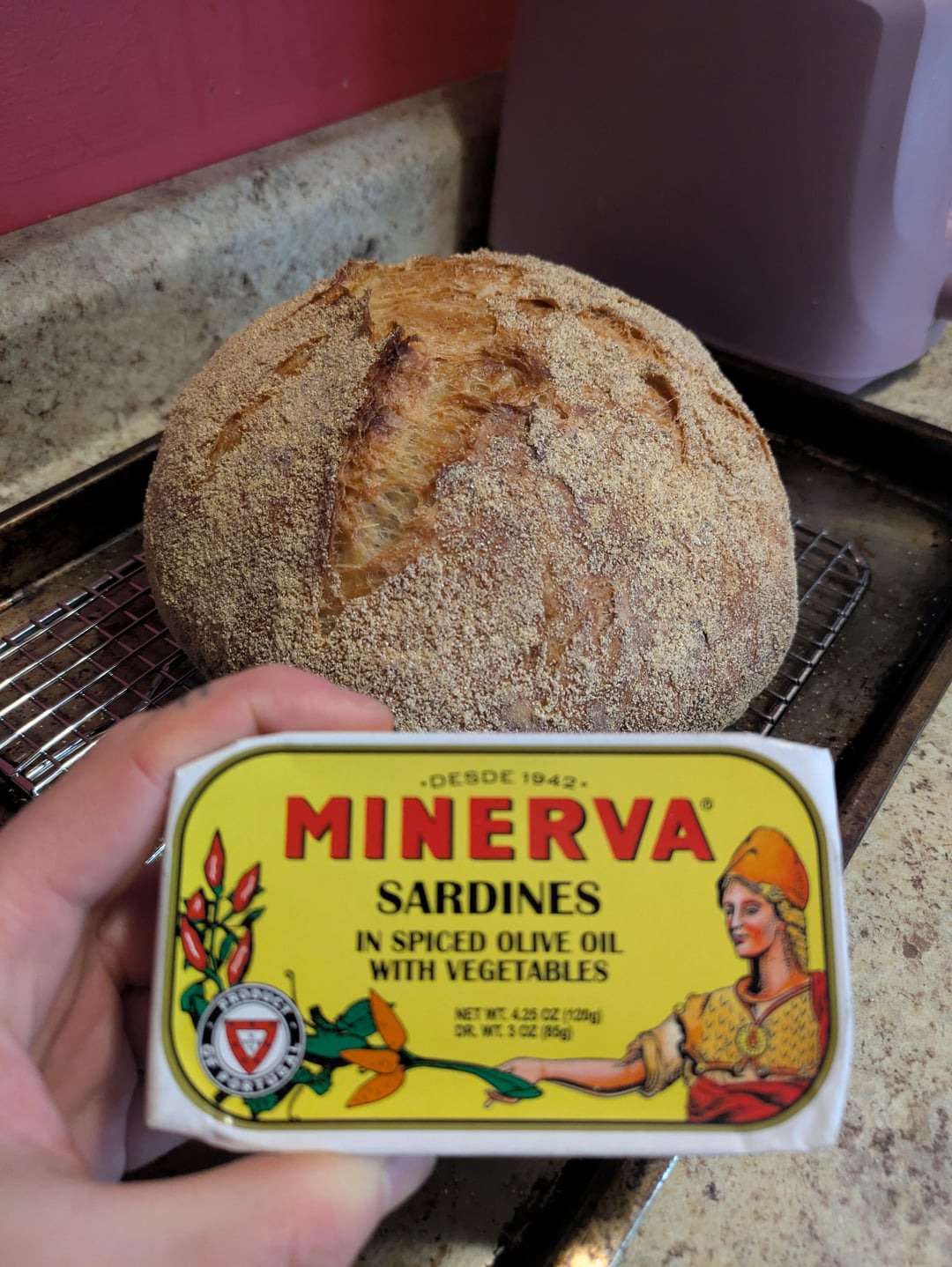 Got this tin of Minerva sardines in spiced olive oil with vegetables from Rainbow Tomatoes Garden a couple months ago and had been saving for a day I could really enjoy them. Since I'm snowed in today I decided to bake a loaf of crusty bread (not sourdough unfortunately, just a regular yeasted load) and pull these out with a little sharp Vermont cheddar on the side. Absolutely beautiful sardines, super firm and with the smallest whisper of a kick from the piri piri in the oil – really enjoyed the couple pieces of vegetable in here too! See second pic for the tin and loaf of bread.