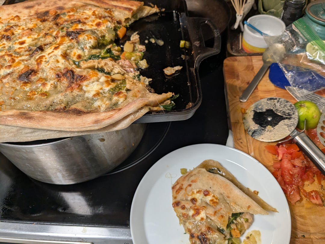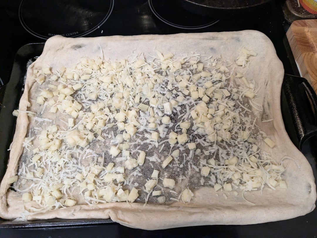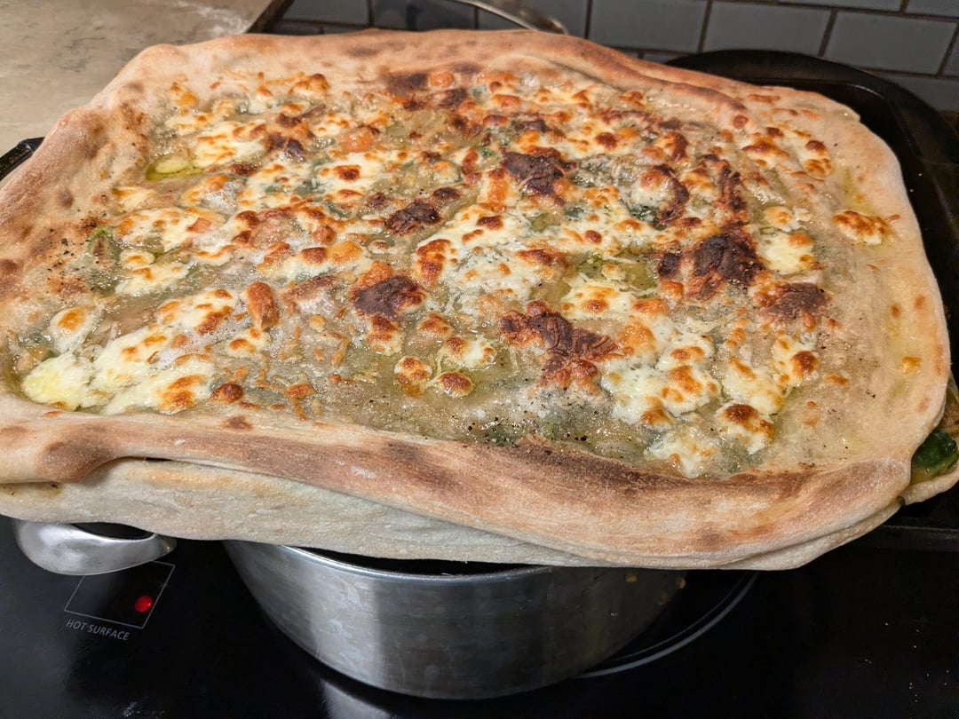 The prior night we had a pizza party using an outdoor pizza oven. The next day, I still had two balls of dough sitting in my fridge, along with the cheese for a couple of white pizzas. The problem was I only had access to my regular oven. I also had pizza several days in a row at this point, so I decided to innovate. Hindsight, I think I committed a crime. Let me know what you think.
