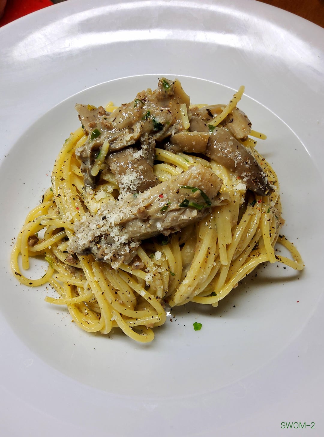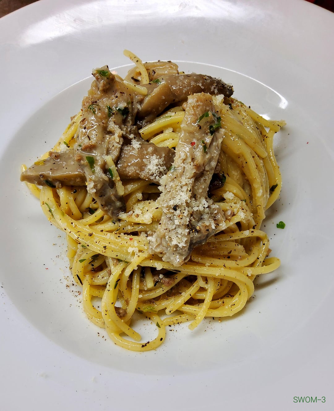 INGREDIENTS: spaghetti (Rummo), oyster mushrooms, beef and pork mince, parsley, garlic, onion, salted anchovies, white wine, olive oil, butter, a tiny drizzle of lemon juice, salt, black pepper. Grated grana padano (optional).