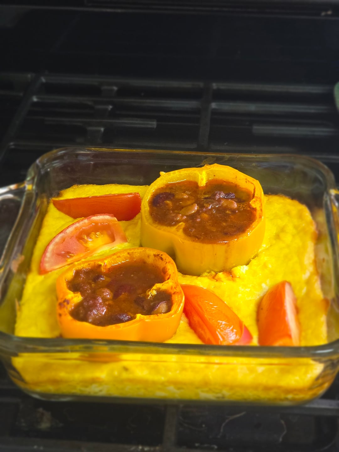 drained corn. Stir in beaten eggs. Turn into greased shallow baking dish. Cut peppers in half, crosswise; scoop out seeds, being careful not to cut through the pepper. Push down into corn, open end up. Fill with chili. Cut tomatoes in sixths. Place around and on top of peppers. Bake in moderate oven (350°F.) 50 to 60 minutes, or until firm. Makes six servings.
