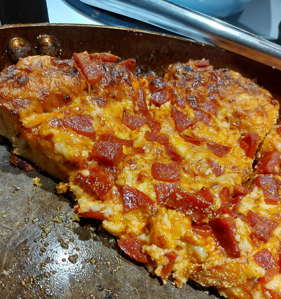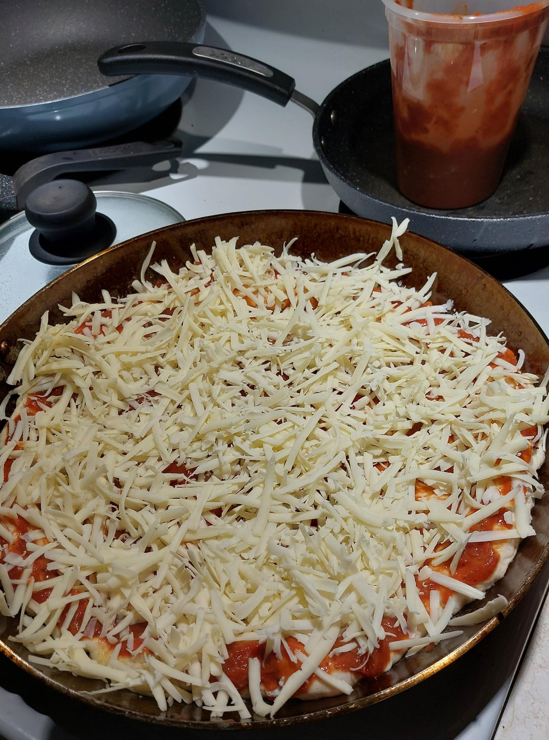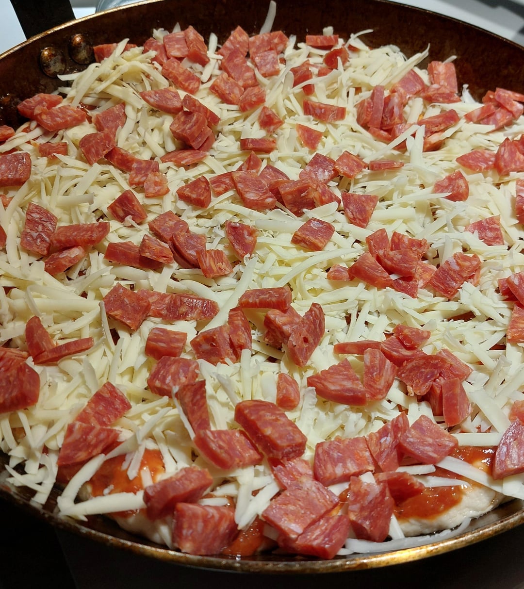 I had the sauce on standby from a previous pizza sauce batch.. Standard brick old cheddar and mozz cheese mix, 350g I’d say, with spicy Genoa chopped/cubed 250g or so.
