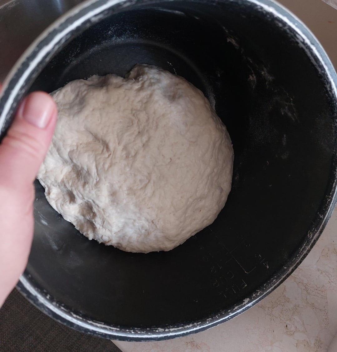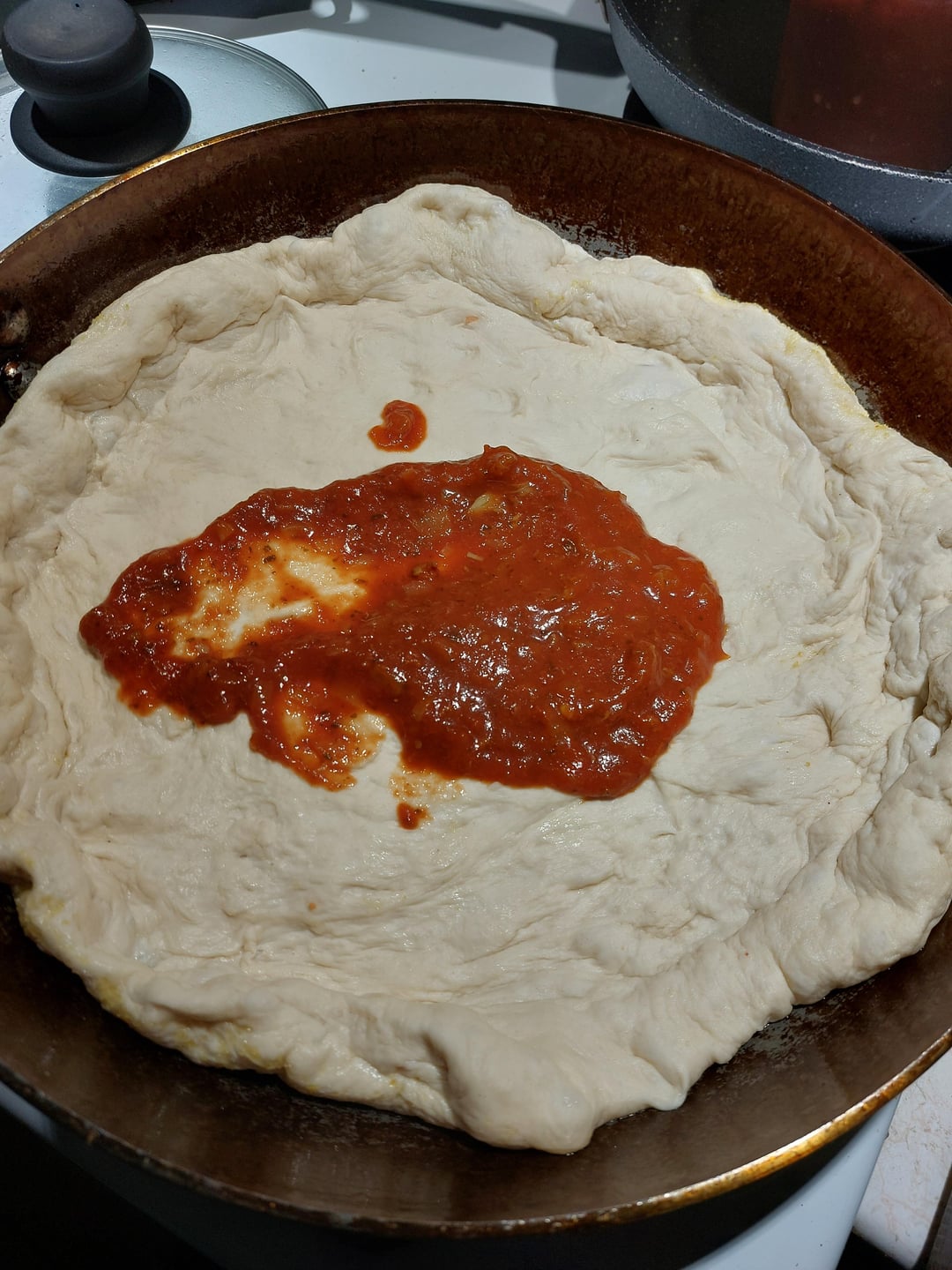Started the dough at 11. Threw it into the oven with the pilot light on. Just that bulb. With the carbon steel pan. But half way pulled the dough to be in a chiller environment, kneaded it 2 times a lot, 1 light, and then I stretched it into a form for the (warmed) pan. And then I let it rest again before I laid out any ingredients.