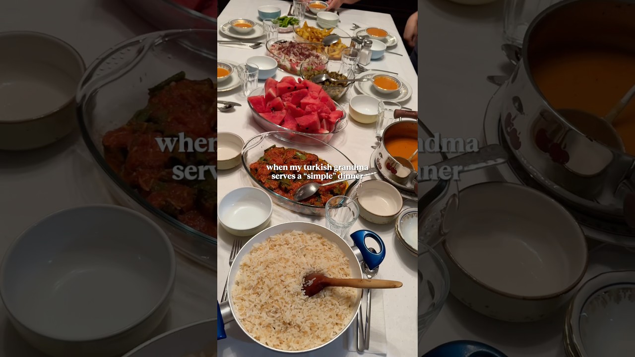 The idea of a “simple” dinner is this table for my beloved grandma🥹💖 She always makes sure to have a great juicy salad, buttery rice pilav, soup, baked potatoes and kavurma (meat sauté) when I visit her. This time she also had some zeytinyağlı dish and kızartma (fried eggplant and peppers with tomato sauce). This was filmed over the summer, that’s why you can see she also served watermelons🫶🏻