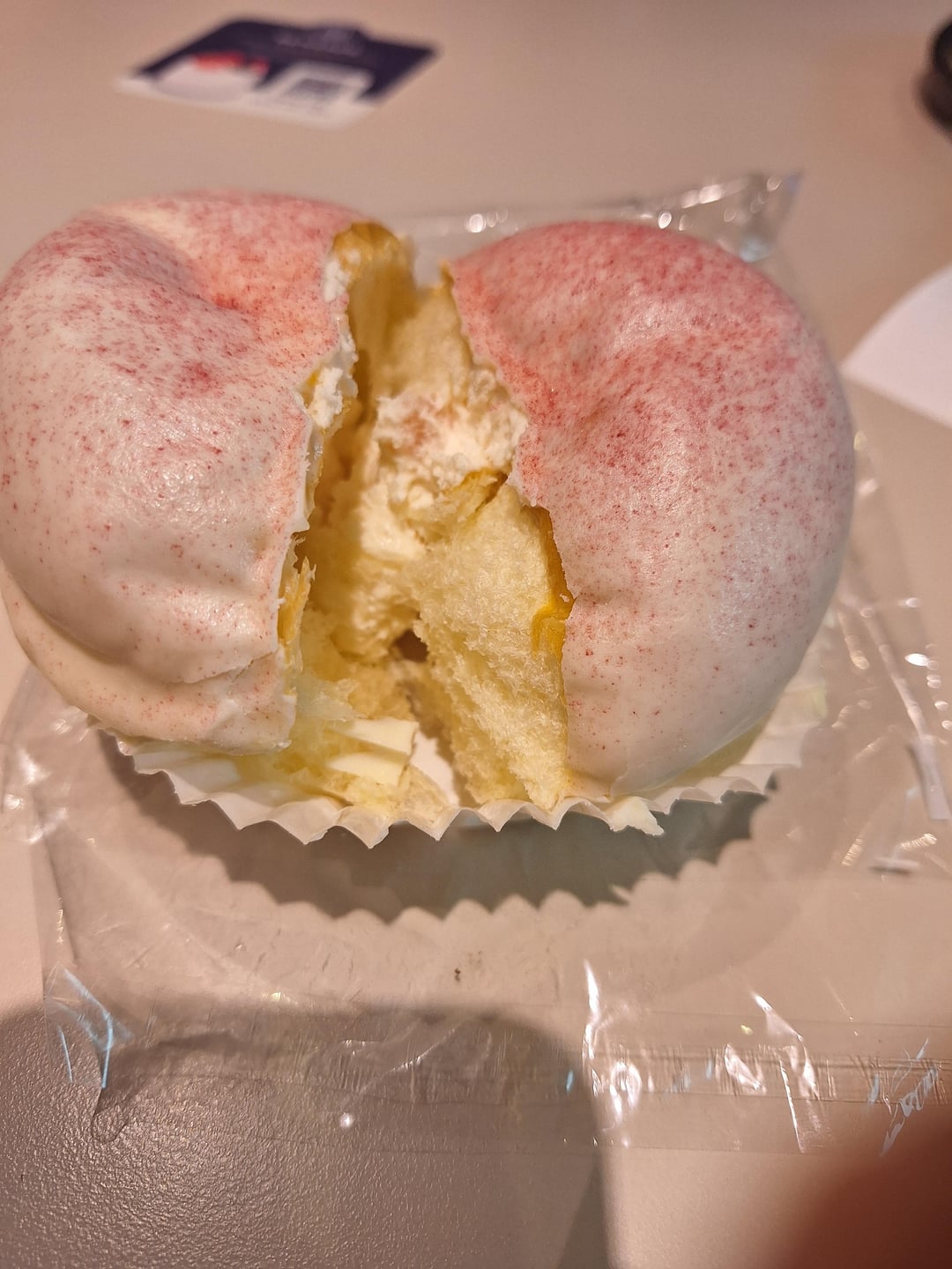 The bun has a white chocolate shell and a peach cream filling with small chunks of fruit(?). I looked online and most of their other buns come out to 200-350 calories, but i can't find the info for this one. I'm assuming the white chocolate shell makes the calorie count higher, so may 400 or 500?