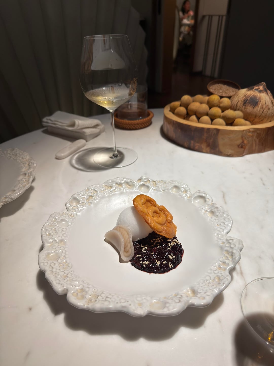 The wine list is undeniably impressive — offering Château d’Yquem by the glass is remarkable. We opted against the wine pairing and instead chose a bottle. Surprisingly, the bottle was not tasted by the service first to check for flaws — a detail that is typically standard at this level.
