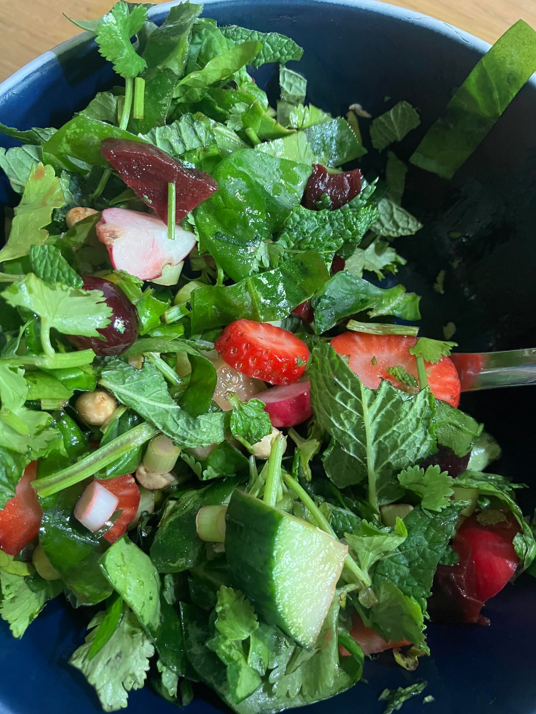A lot of my salads look the same, but here we are, eh.. Second pic is because the non-fruit items were hidden under the leaves in the first one, so you get a shot of after i stirred it together, too. Salad measurements are just what arose from chopping stuff and throwing it in a bowl.