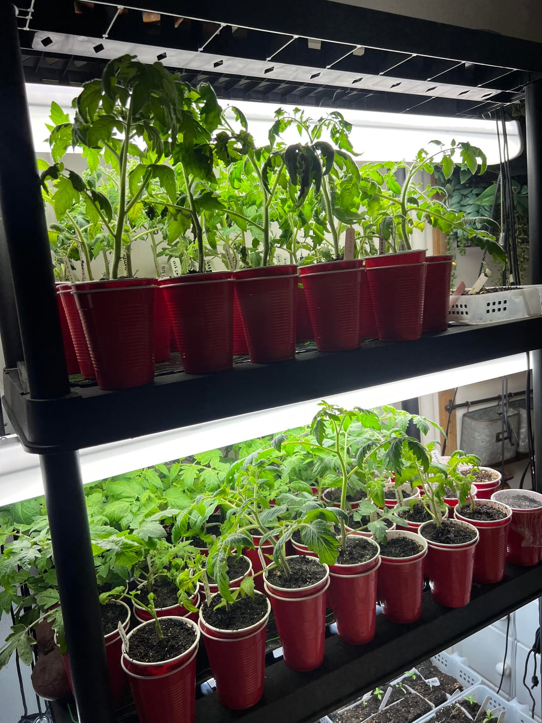 When I’ve started too early, I dig nice deep holes and let them grow more roots. You might also pot up to gallon pots, if you can make space for them. I’d bury as much of the stems as I could.