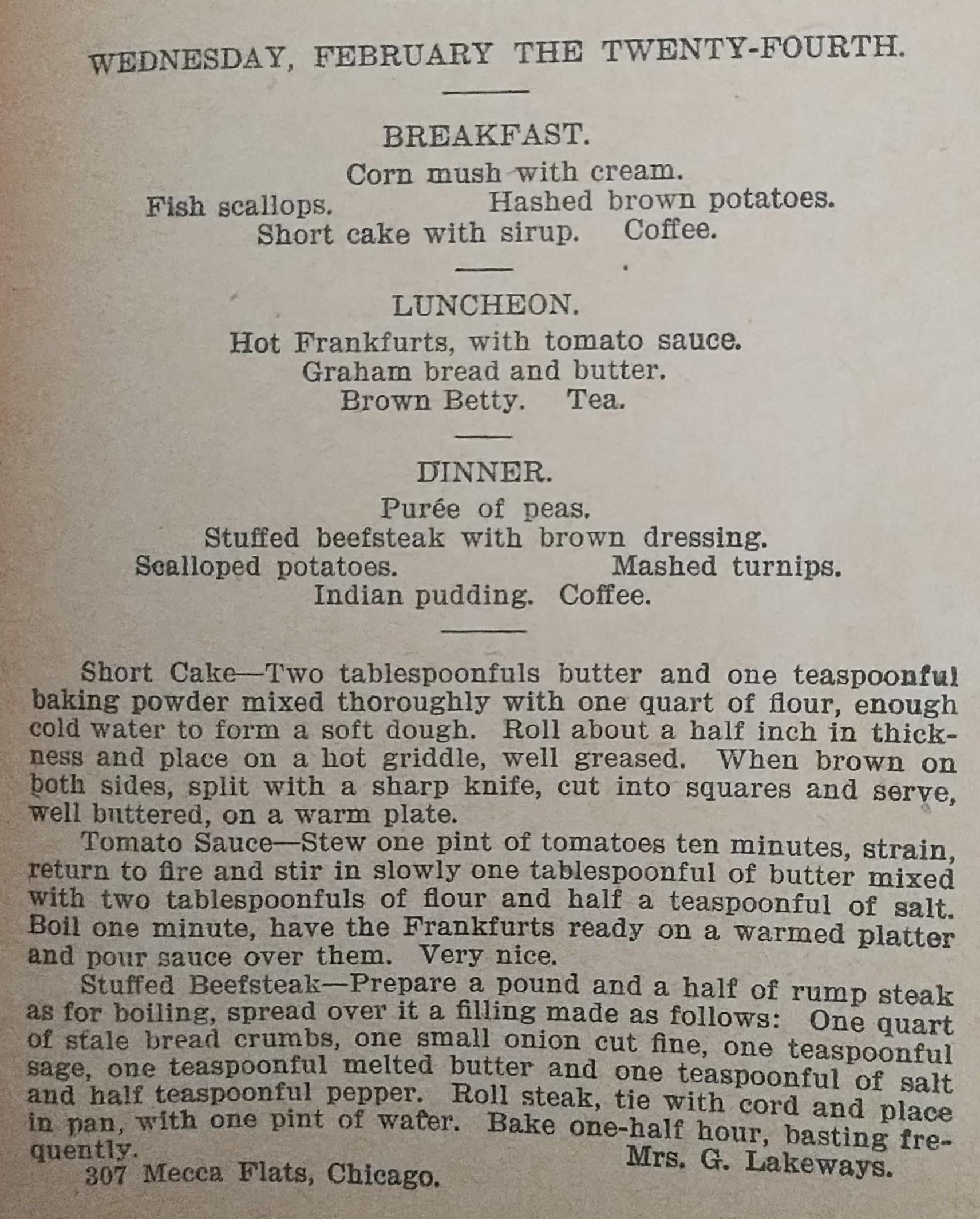 Menu for February 24th 1896by Weary-Leading6245 2 Comments PurpleMuskogee 1 month ago I had to look up what Brown Betty was! Very similar to apple crumble, the first dessert I learned to make as a child. Sounds delicious. DaughterOfFishes 1 month ago The Daily Fish strikes again. I cannot face fish scallops first thing in the morning(or any time really).But as long as someone takes my fish, the rest of the day is ok. Hot dogs in tomato sauce is kind of weird but I’m willing to give it a try.