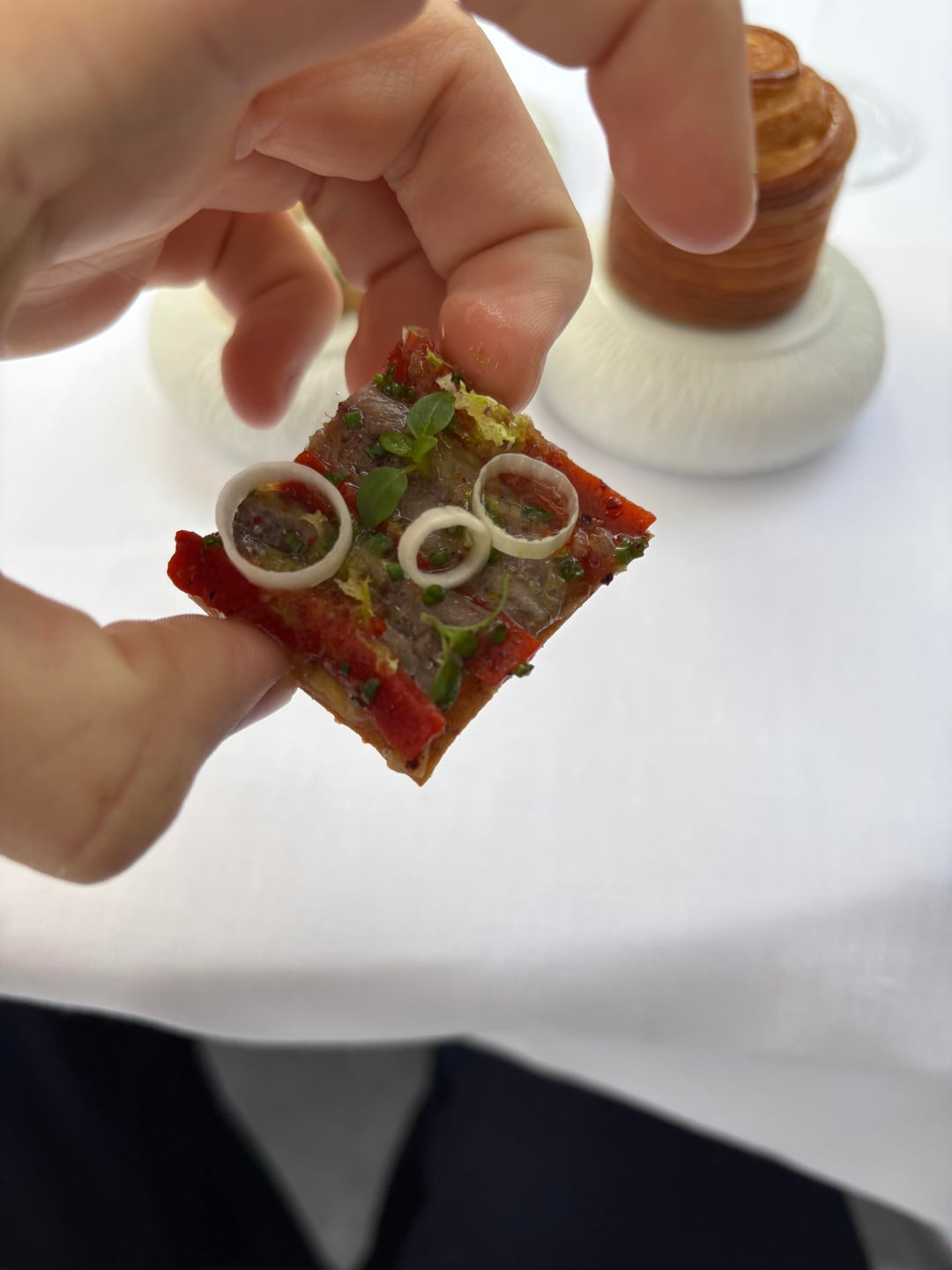 After that came some more amuses: a little toast with confit aubergine with bell pepper and anchovy