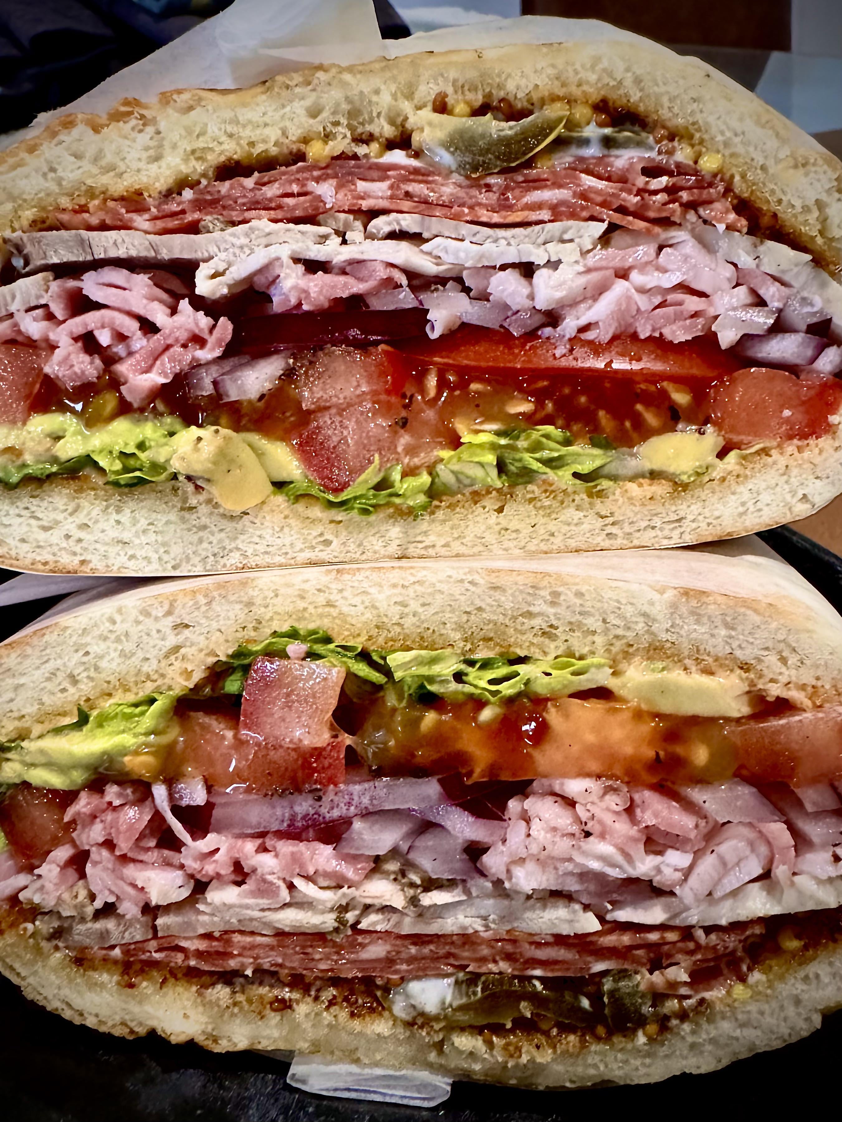 Had some random leftovers in the fridge and made this beauty. Hot salami, roasted pork, shredded ham, lettuce, avocado, tomato, onion, pickled jalapeños, chipotle mayo, seeded mustard and Italian dressing, on toasted garlic focaccia.