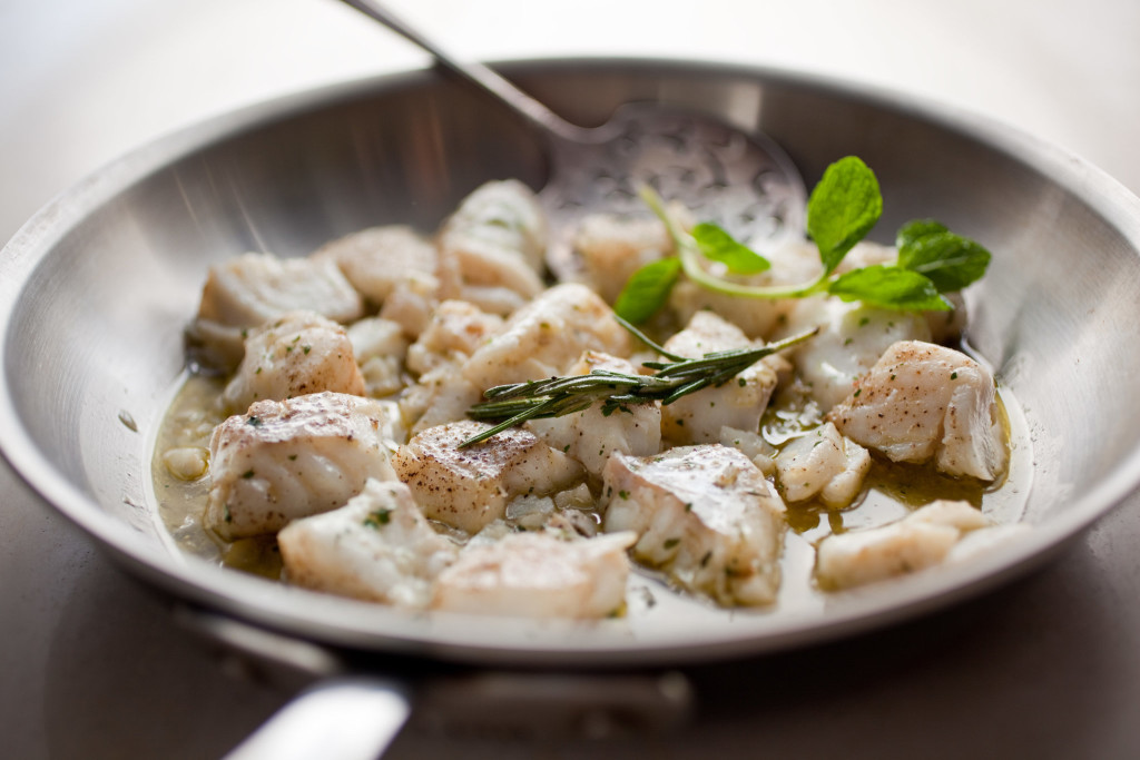 1. Season halibut all over with a generous pinch of salt and pepper. In a medium-size skillet just large enough to hold fish cubes in a single layer, heat oil over low heat. Add fish, rosemary sprig and dried mint, and let cook slowly until fish begins to turn opaque, about 3 minutes.