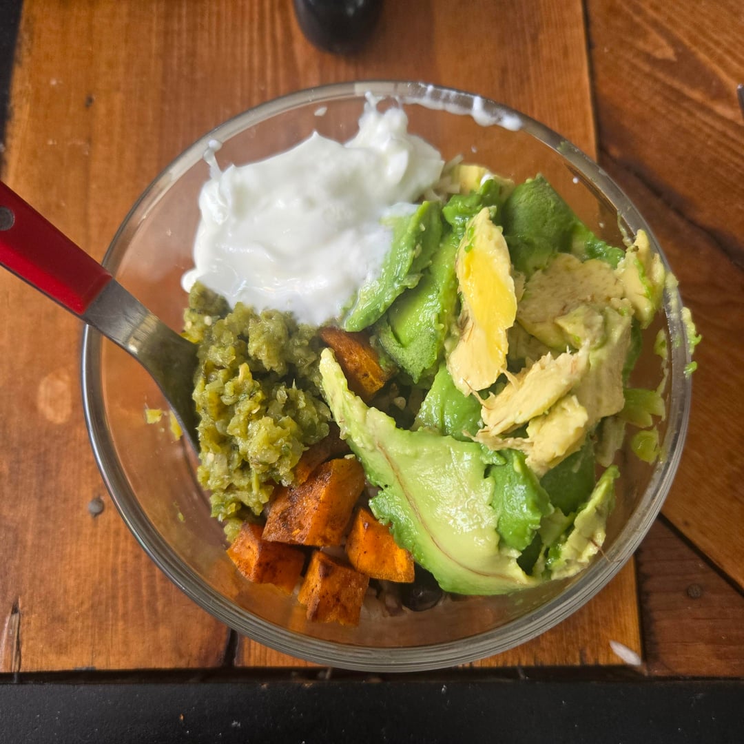 After heating I top them with a whole small avocado, a bit of salsa verde, some greek yogurt, and a bunch more lime.