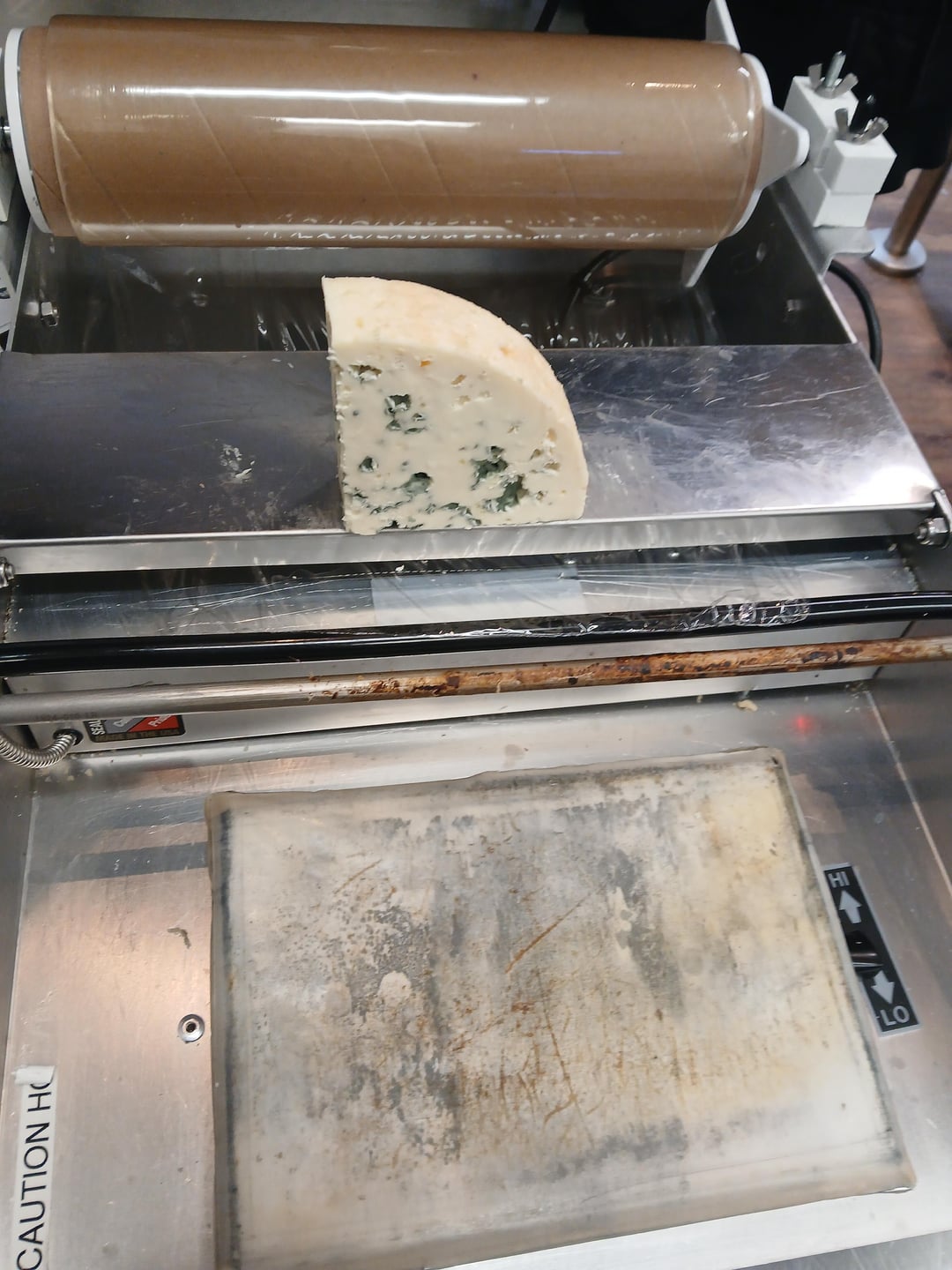 6) Now for wrapping. The tension on the roll of shrink wrap is adjustable. Some things wrap easier with more tension, some things don't wrap well no matter what you do (looking at you, Fromager d'Affinois). My first encounter with the cheesemonger side of my department was helping to wrap a few things. Boy did I screw up at first……