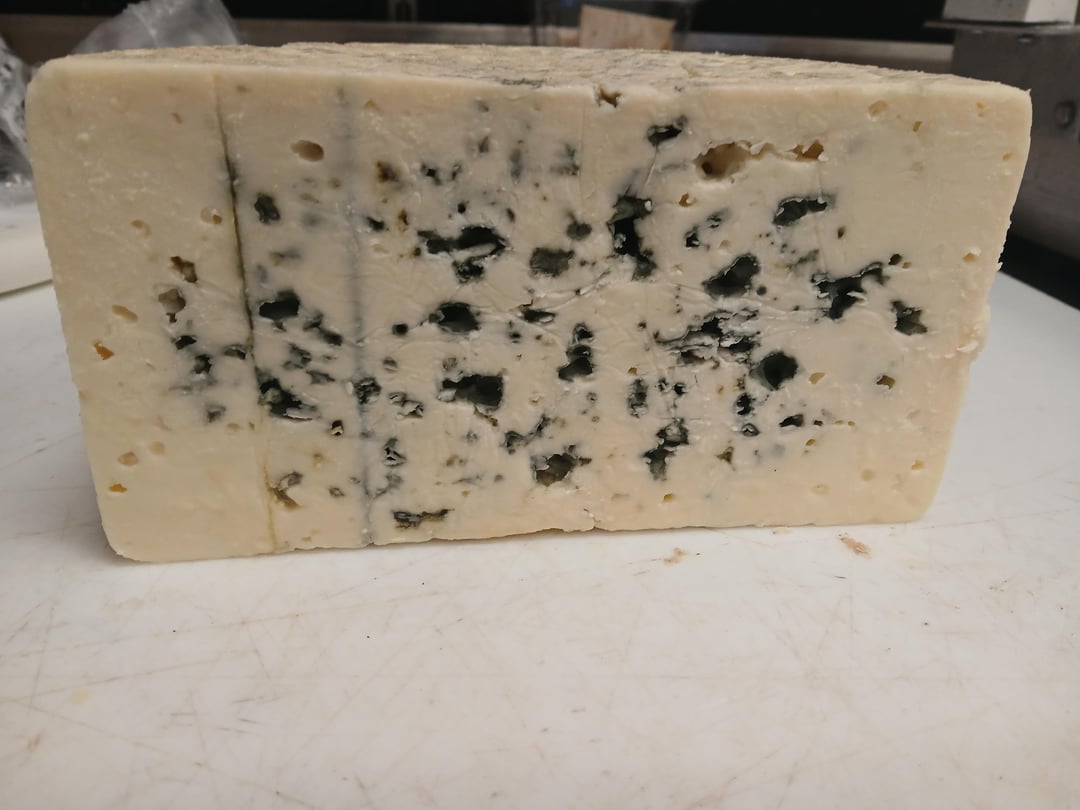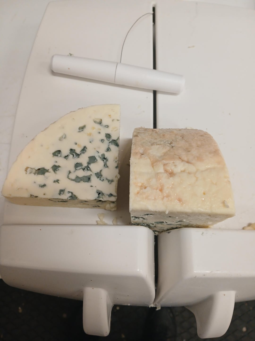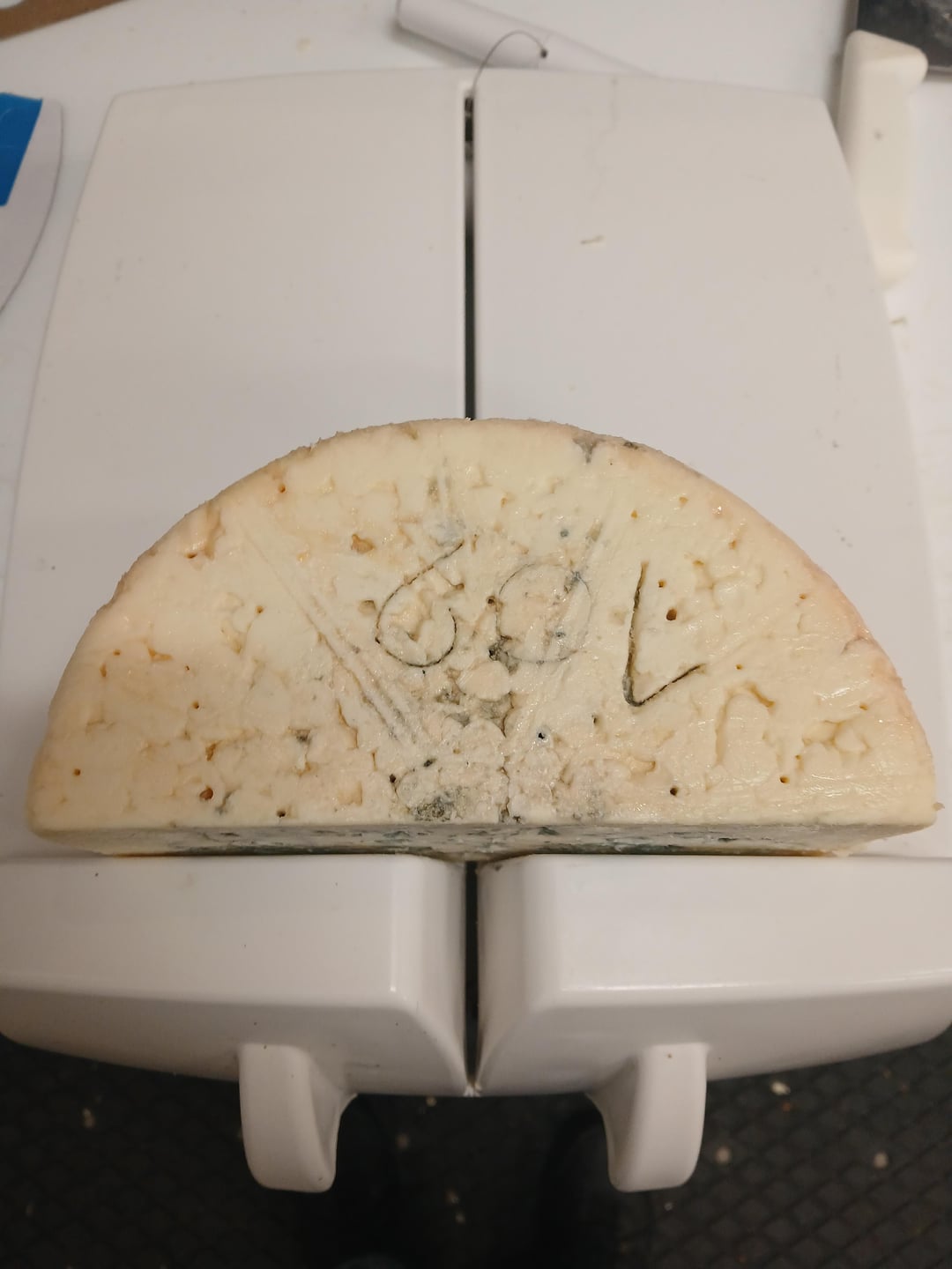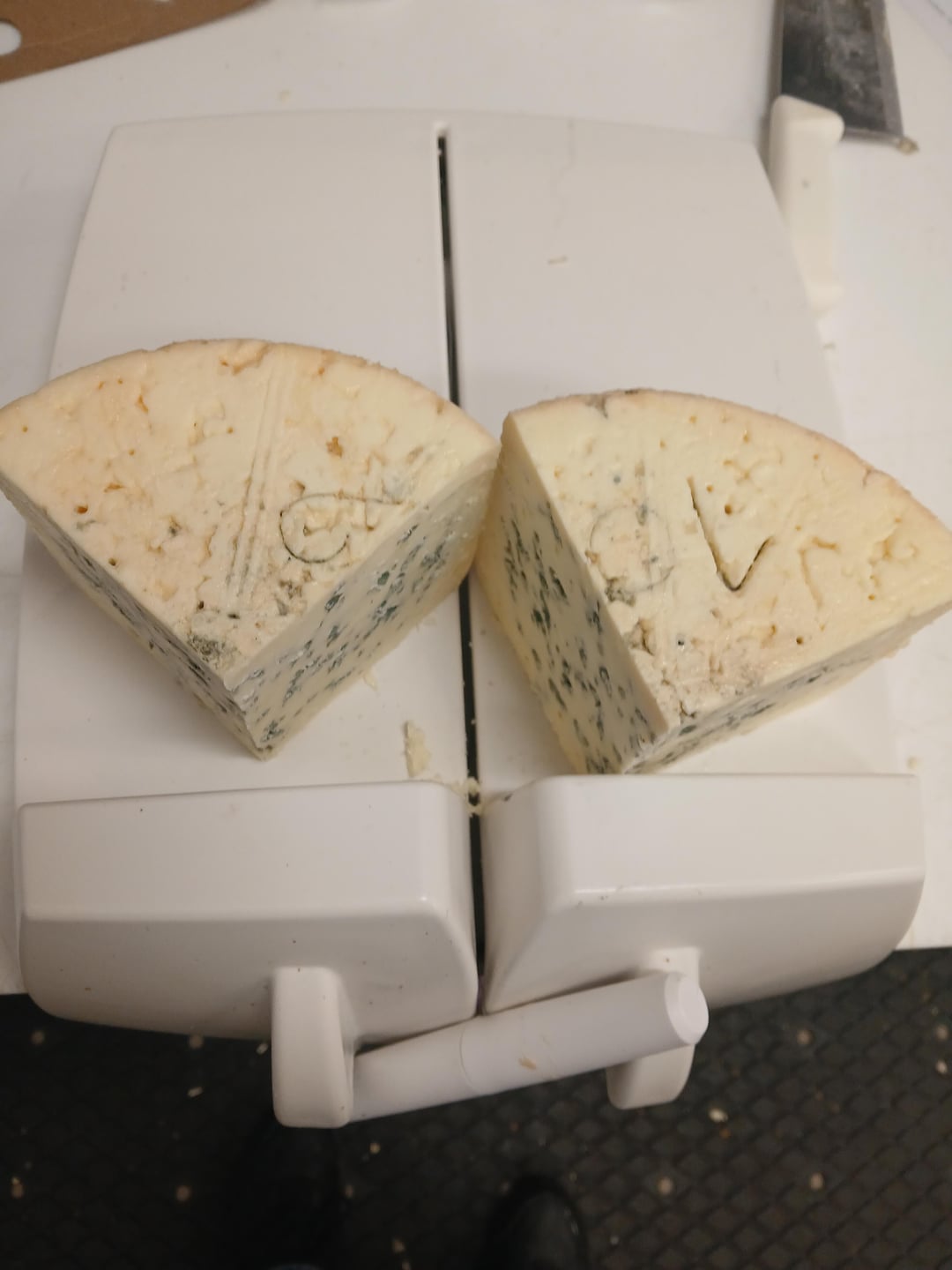 3) Next we get our cheese on the wire cutting board. Almost any round cheese is going to look like this on the board. This Roquefort is being cut into quarter moon pieces, but anything being cut into wedges would be in the same position.