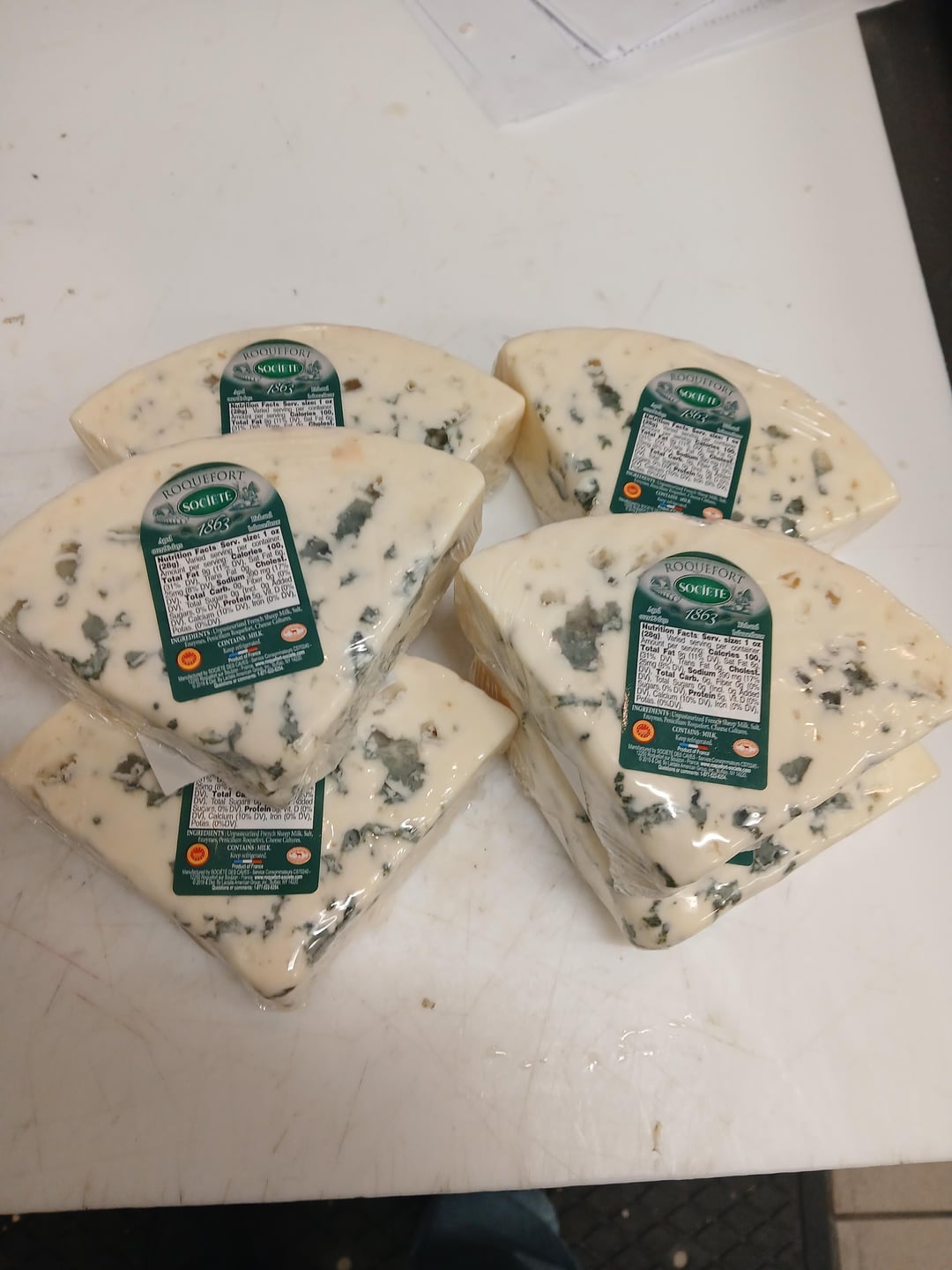 1) Out of the box, our Roquefort is wrapped in foil with a plastic base. There is an outer plastic wrapping as well.