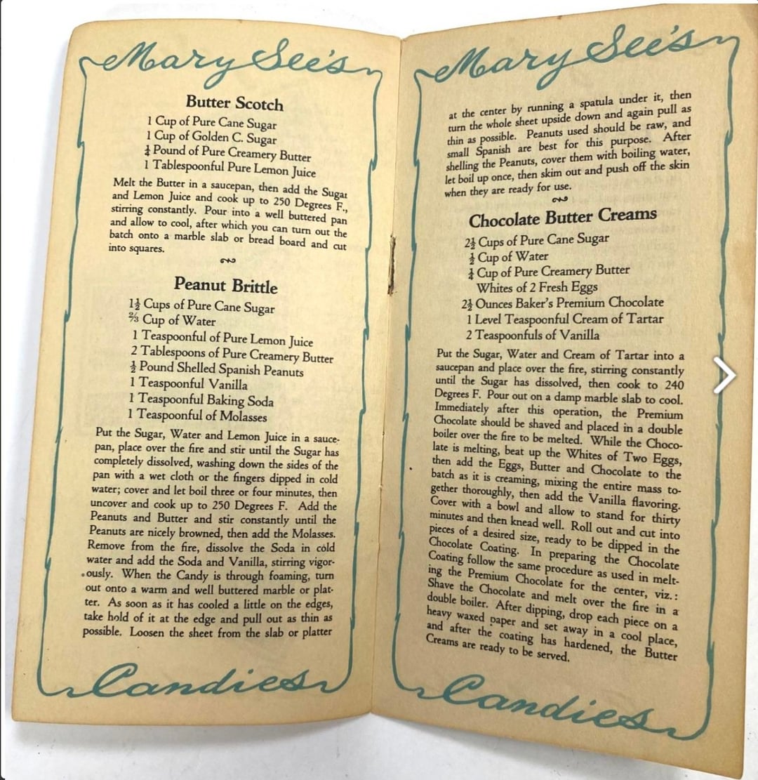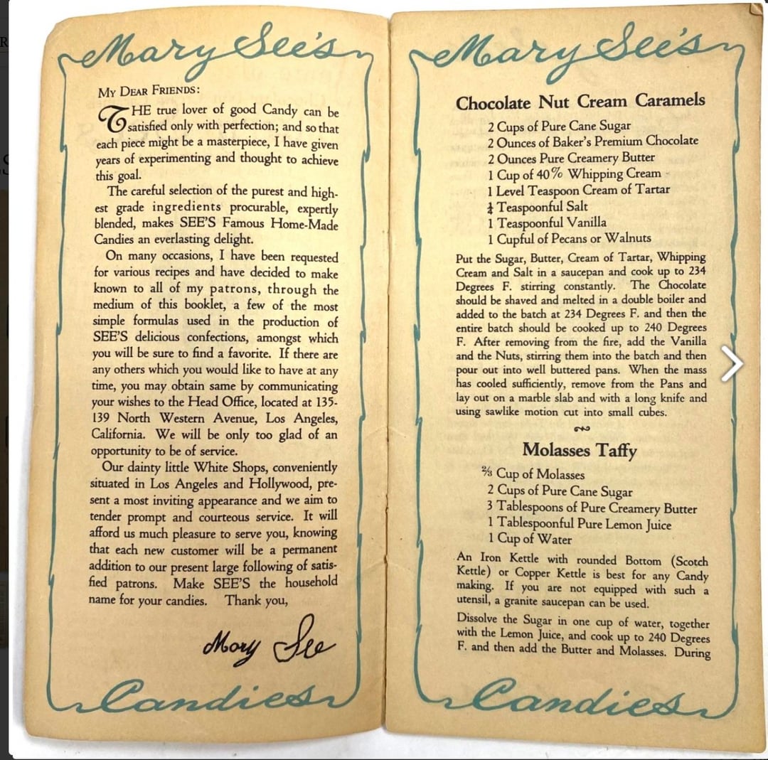 So…I have been trying like the devil to find this one. In 1925, the See’s Candies company released a 12 page pamphlet with 8 recipes. A couple of copies have surfaced over the years and been auctioned, occasionally with pictures of PART of the pamphlet. The recipes were: