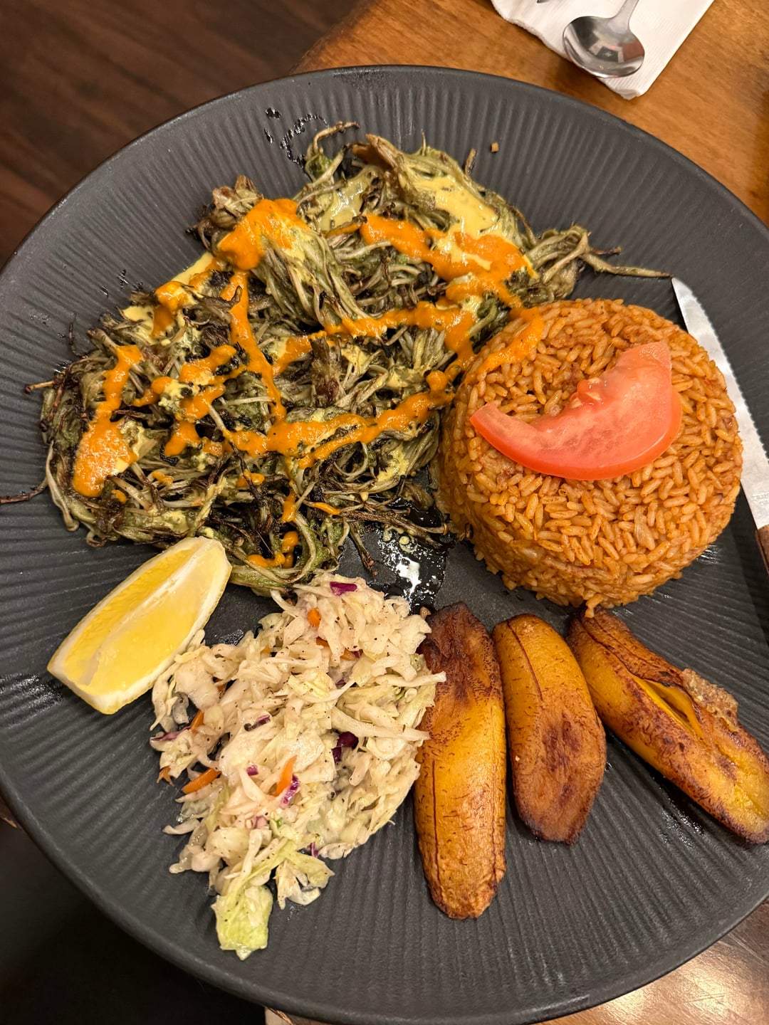 Enoki mushrooms and jollof rice, red stew with smoked tofu and fufu, bitter melon stew