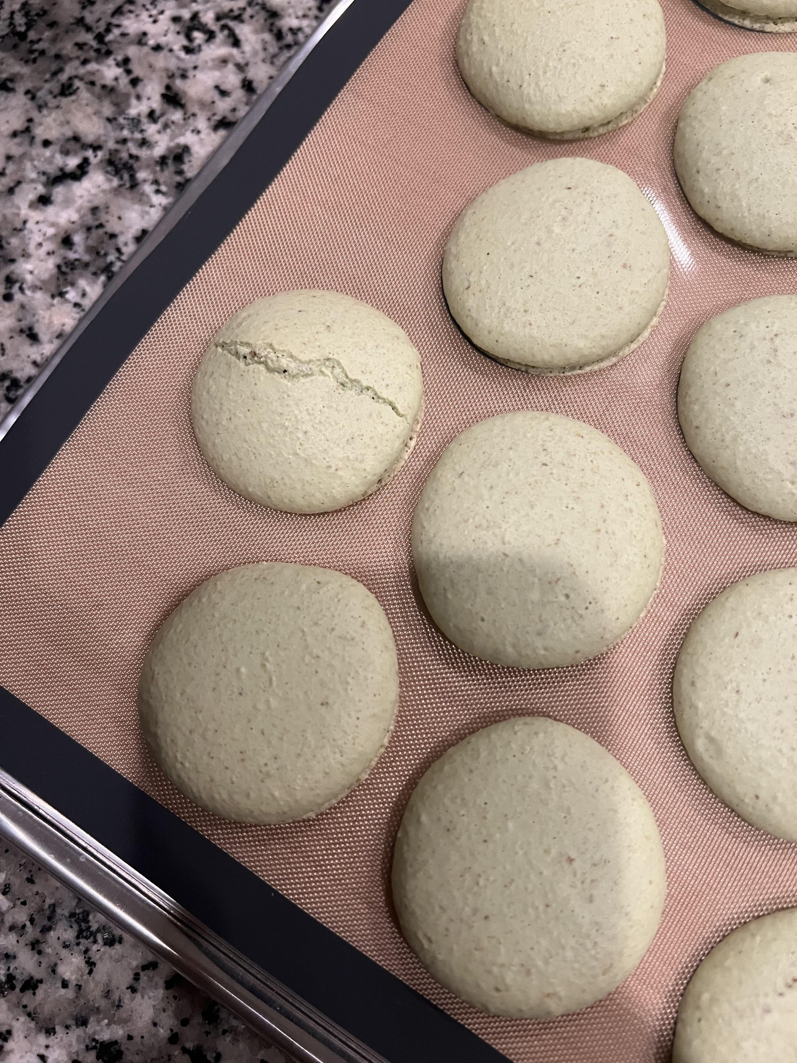 However, when you find they’re droopy and get a perfect middle crack like shown in the picture, I’ve often found it to be that they were actually dried too long. When your shells dry for too long, part of the batter sticks to your sheet and as the rest of the shell rises in the oven, the stuck part stays glued to the sheet and can’t rise. The foot doesn’t form there. This creates uneven stress along the surface of the shell, and leads to cracking.