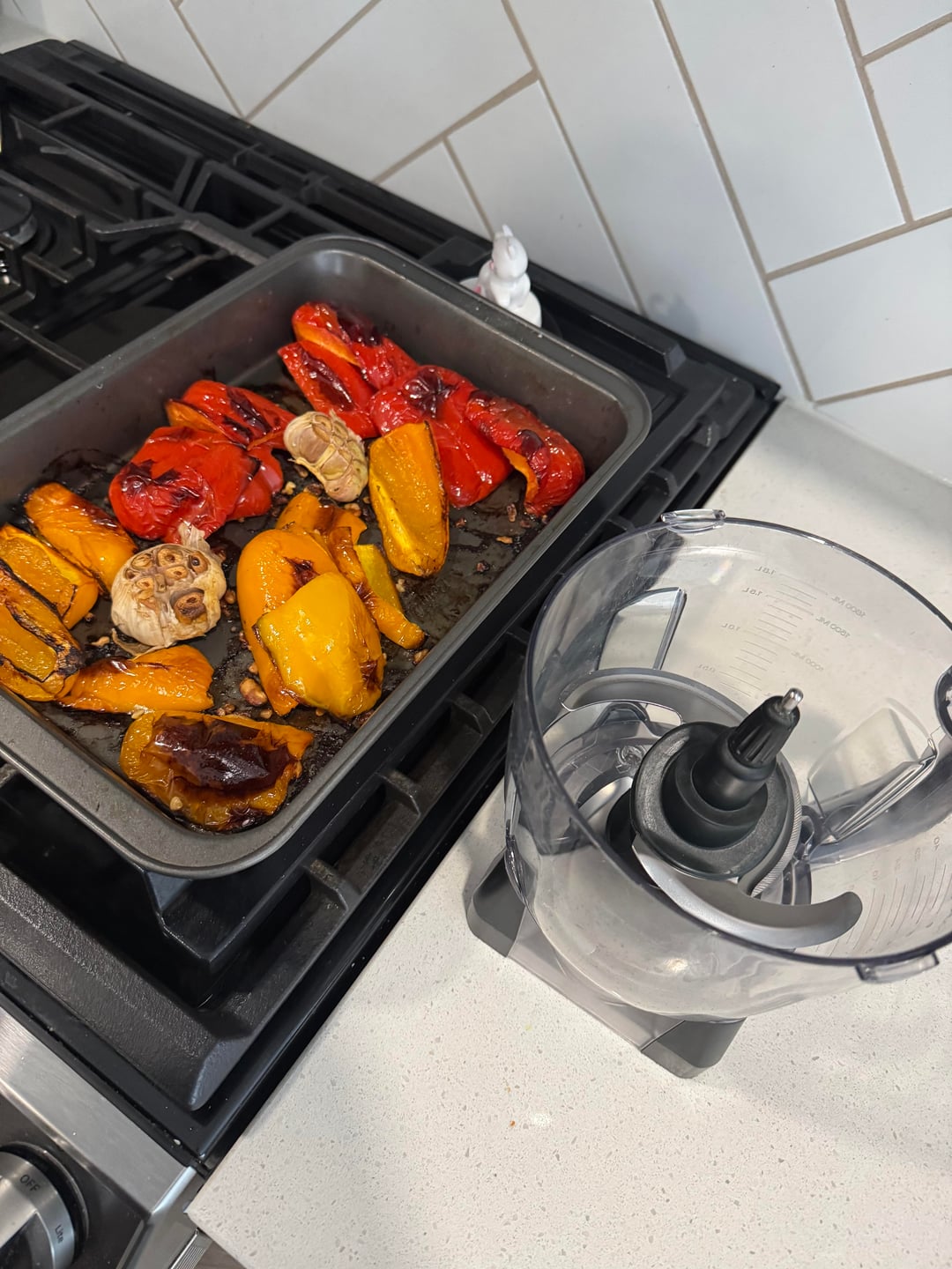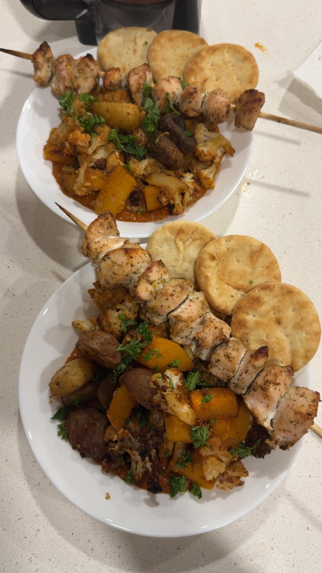 Made a roasted veggie bowl with pepper dip + chicken + naan (full batch breakdown)
