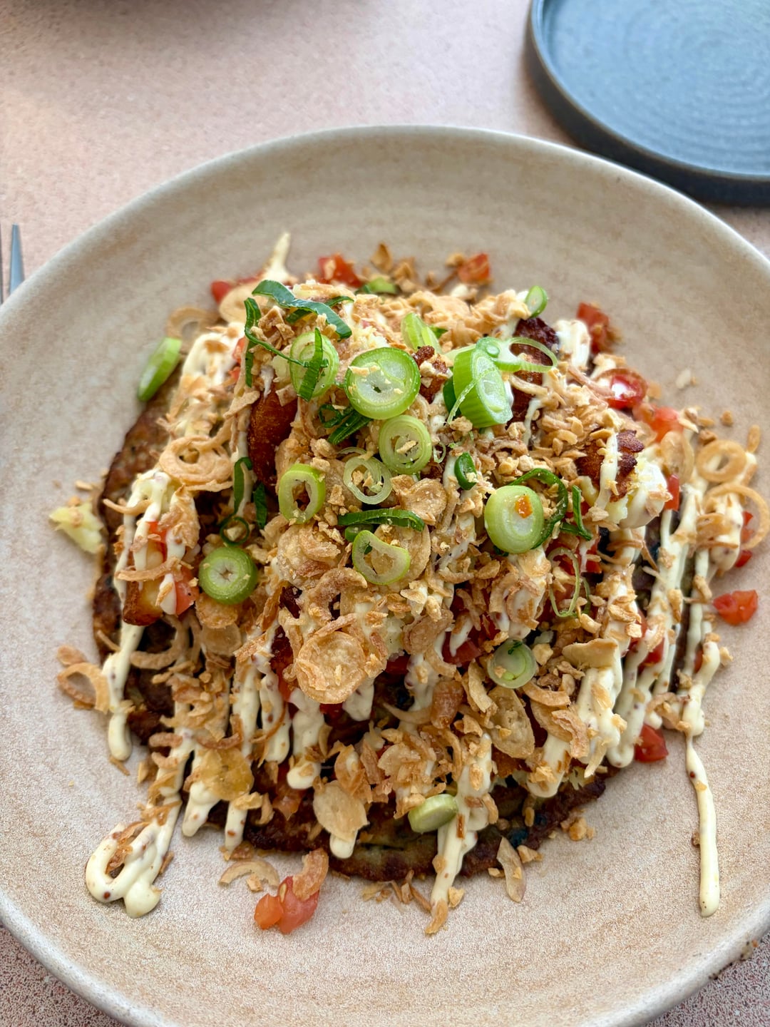 Tortang talong: charred eggplant omelette with rosti, garlic aioli and pico de gallo. It was served on rice and had roasted garlic chips sprinkled over the top, and was really delicious.