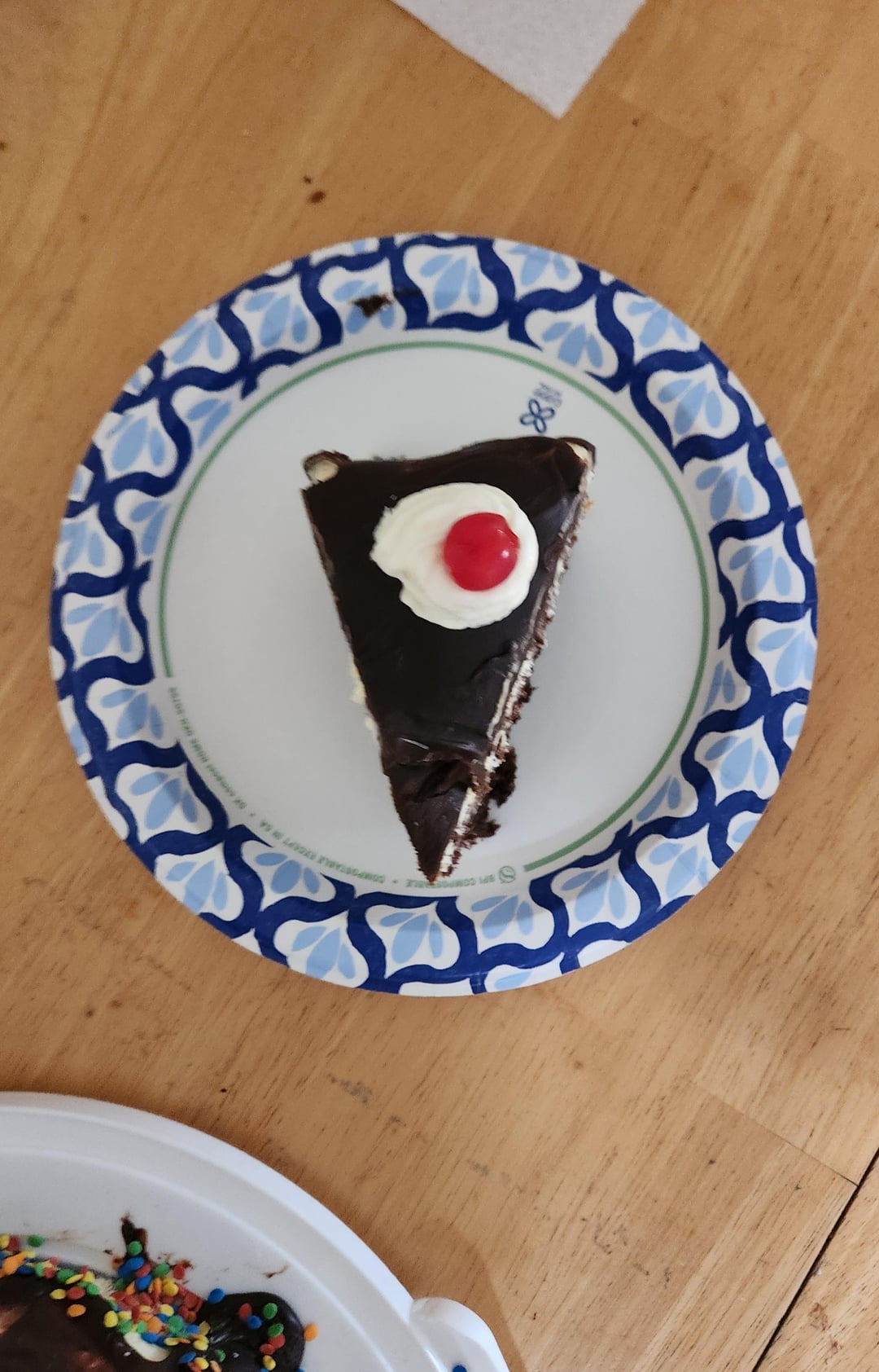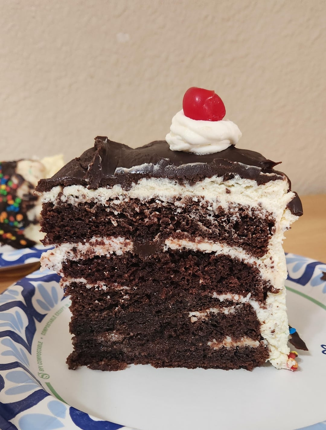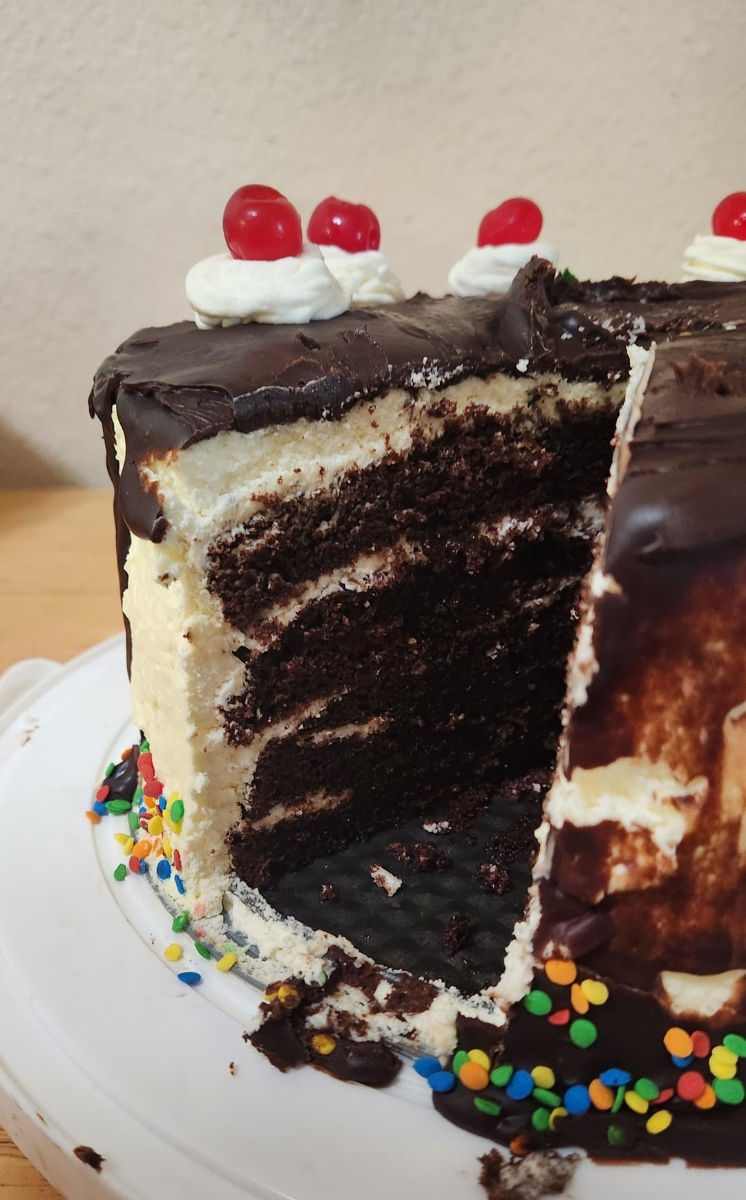 This is a Devil's food cake with 5 layers. Each layer has rings of caramel sauce, hot fudge, and marshmallow fluff buttercream. The icing is a French vanilla Chantilly cream with a dark chocolate ganache drip, rosettes of marshmallow fluff buttercream topped with maraschino cherries and adorned with rainbow sprinkles.