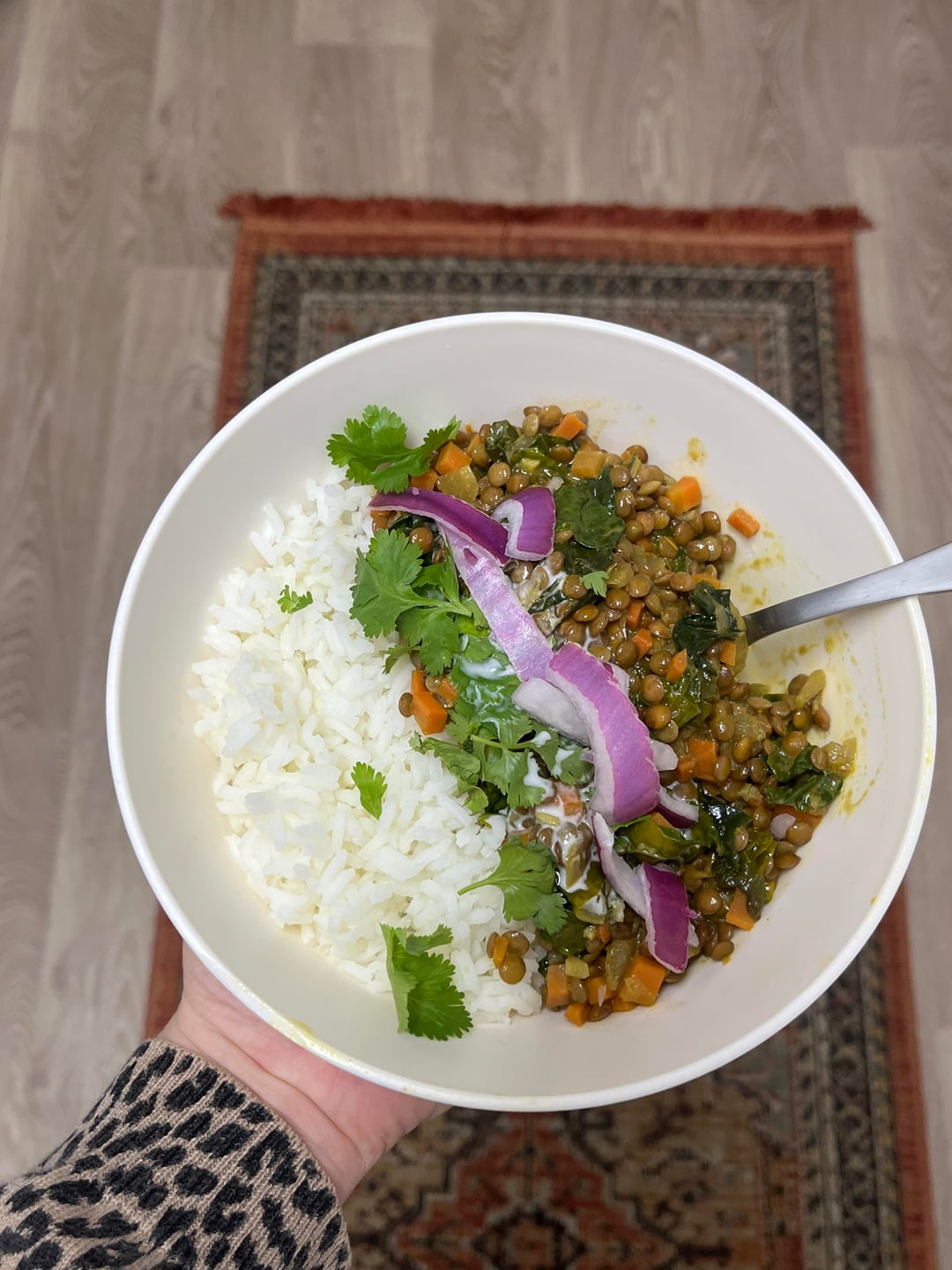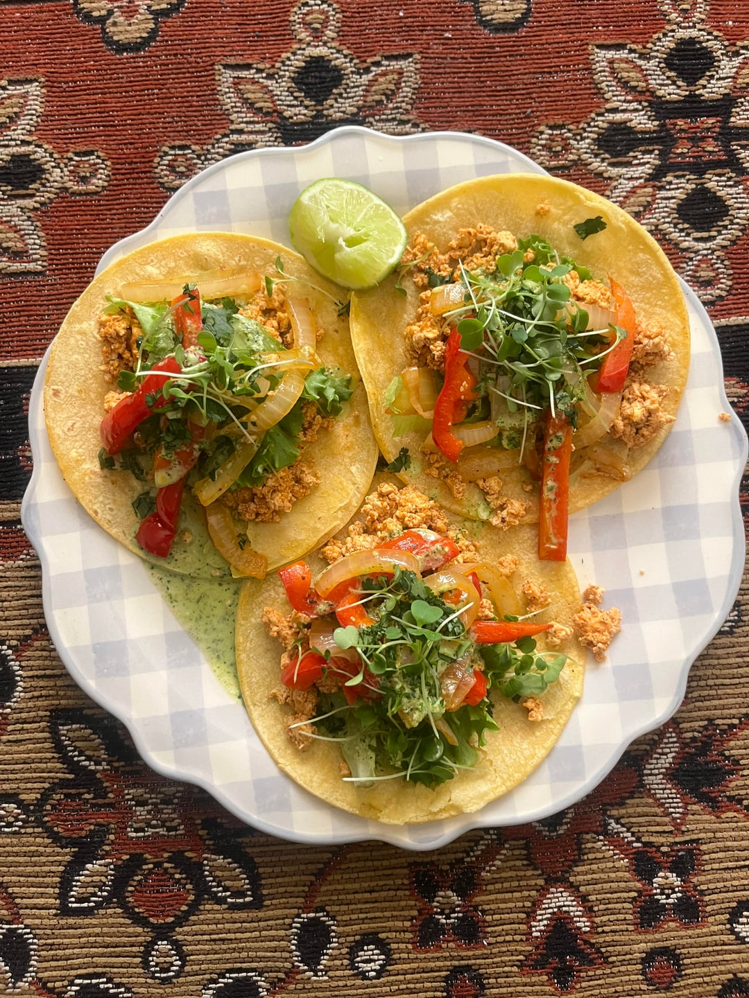 1) charred cabbage over white rice with roasted red pepper sauce and crumbled tofu