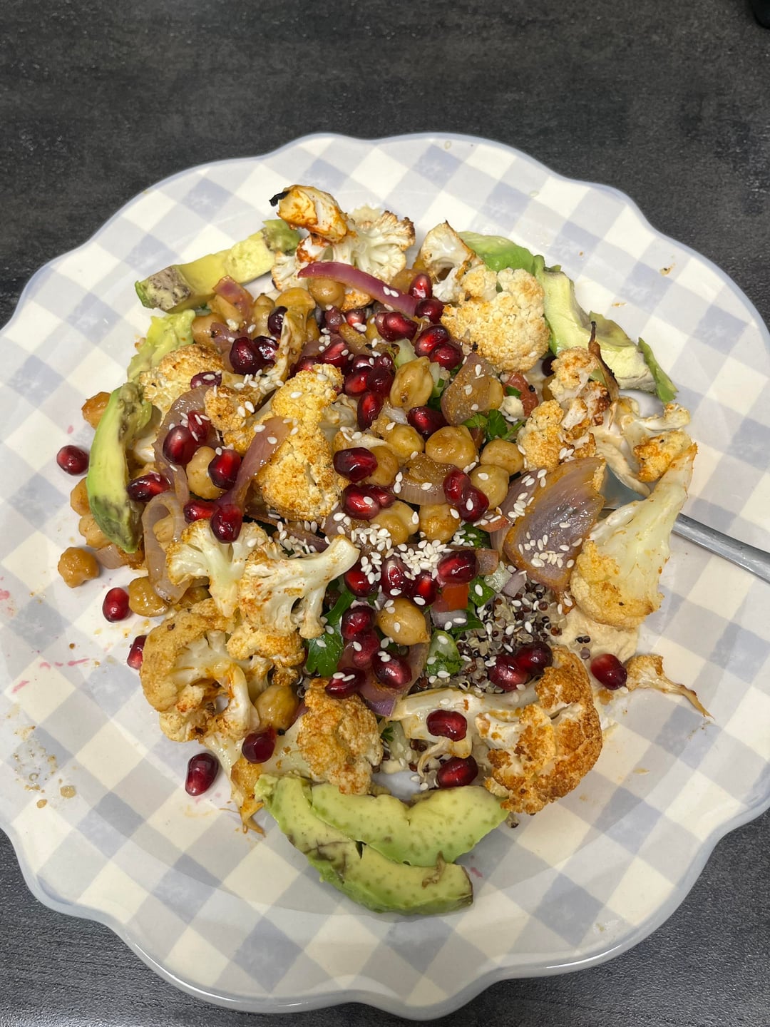 6) crunchy chickpea, cauliflower, an butter bean hummus bowl