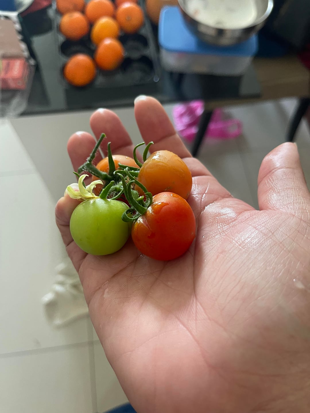 I do see that there’s a larger tomato in the back, so this plant is producing smaller fruit than optimal. Growing the largest tomatoes possible means you have to keep the plant as happy as possible. Happy plant with everything it needs = lots of big fruit, less happy plant = fewer and smaller fruit. Requirements are EVERYTHING a tomato plant needs, like optimum nutrition, water, light, temperature, sleep, oxygen, carbon dioxide… lots of things at the correct timing that commercial growers try to master to maximize profit. The right genes are required, too. Even commercial growers will often cut their flower trusses to limit the number of fruit per truss so that the fruit sizes can be larger.