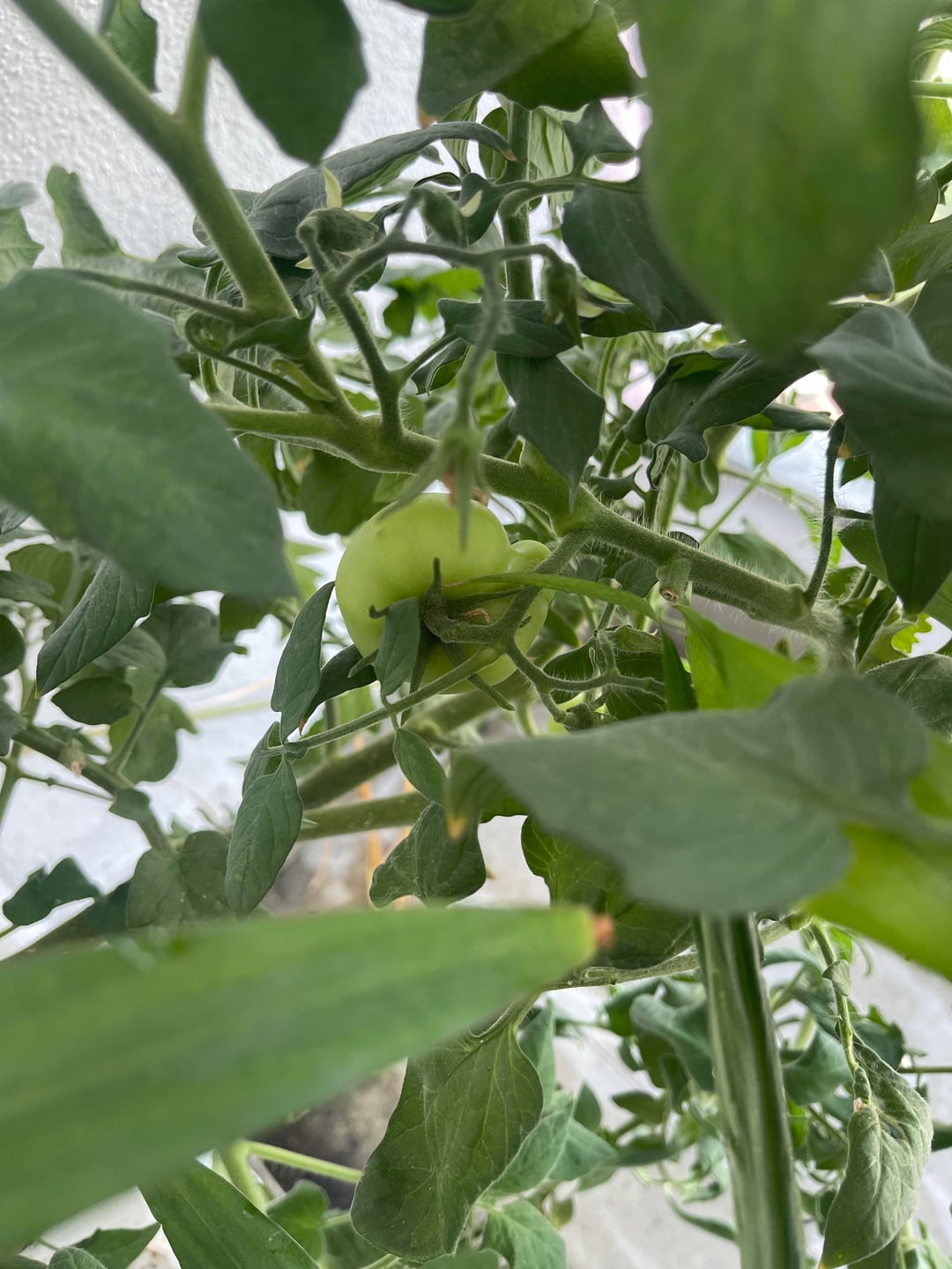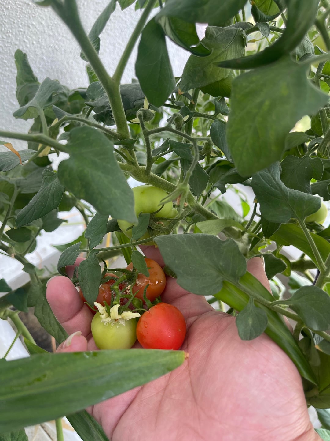 So just try keeping the plant as happy as possible. It’s obviously happy enough to fruit a little, and that by itself says you put a lot of effort into your plant (so great job!). Optimizing is a years-long process of learning. You mentioned that you put a trunk/root fertilizer in there, so nutrition might not be a very good ratio. That might be a good place to start troubleshooting, but don’t buy anything yet — give it a few weeks and see if things aren’t getting much better. Another thing that might be an issue, though it’s hard to tell from just a picture, is that the roots might not have a lot of space because it’s sharing the container with other plants. Tomato roots want to become bigger than a big human head over time so that they can suck a ton of water and nutrients every day. Usually, 10+ gallons of soil per tomato plant is recommended to make things easier on the plant and the gardener.