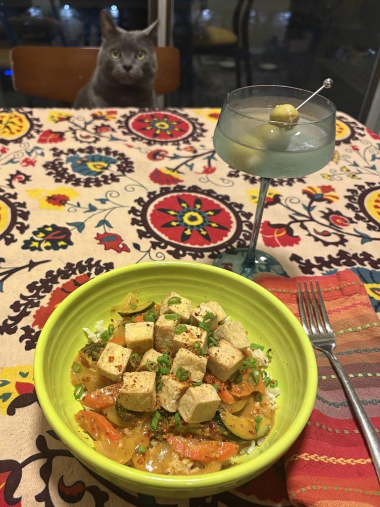vegetable coconut red curry, fried tofu, brown rice, dirty martini, judgy cat