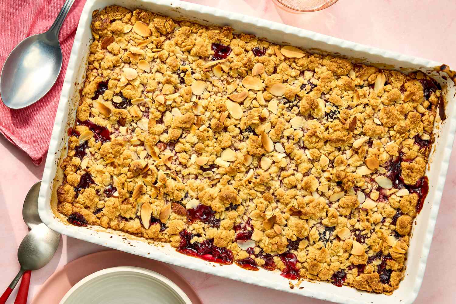 Sweet, jammy cherries and a buttery oat and almond topping bake up into a cozy, crowd-pleasing dessert that will look like you spent days planning—even if you panicked and made this just an hour before your guests arrived.